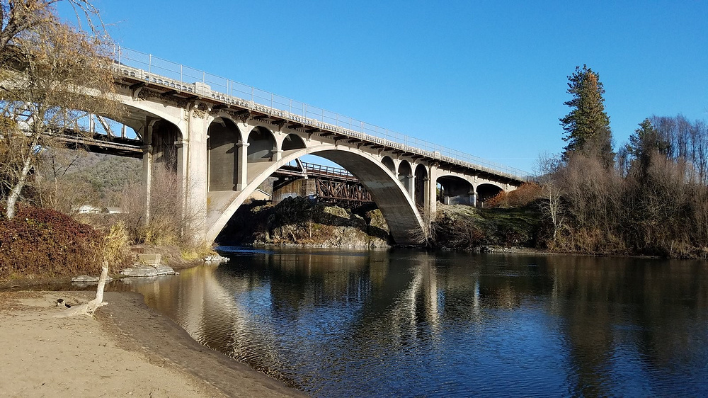 Gold Hill’s historic bridge over the Rogue, an open-spandrel concrete arch built in 1927.