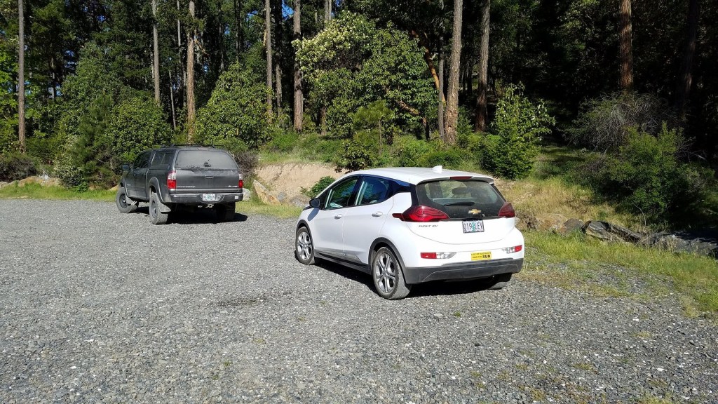 We hiked the East Applegate Ridge Trail yesterday, on a lovely May day. This is a new trail, opened in 2017 as the first part of the anticipated Applegate Ridge Trail system (ART), which will eventually connect the Jacksonville Woodlands, near Jacksonville, Oregon, to the Cathedral Hills regional park near Grants Pass. The East ART runs from Sterling Creek Road south of Jacksonville to Highway 238, a bit north of Ruch. Total length (one way) is 5.6 miles; we walked a little over two miles out from Sterling Creek and then turned and walked back, for a total trail distance (according to my fitness app) of 4.3 miles. The last half-mile of road to the trailhead is pretty rough, but I got the Bolt over it with no problems. (I did notice that every other car sharing the trailhead with us – there were three, one when we arrived and two more as we left – was a honking big 4WD pickup. Take that for what it’s worth.)