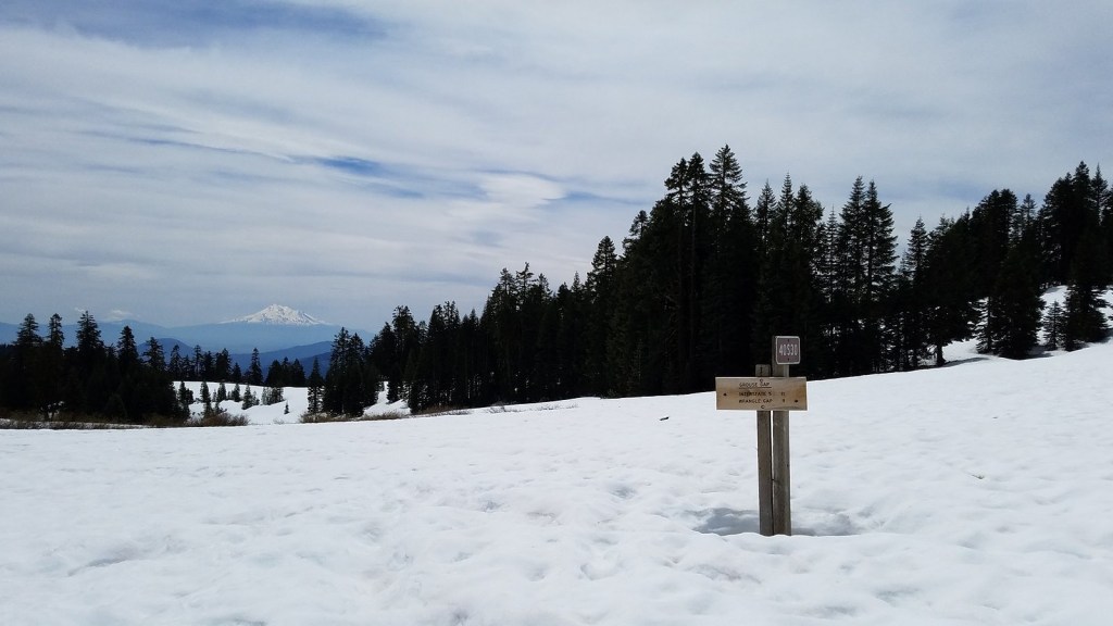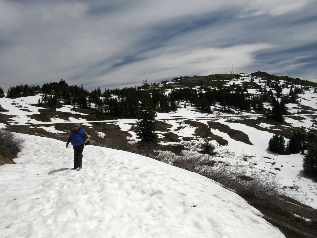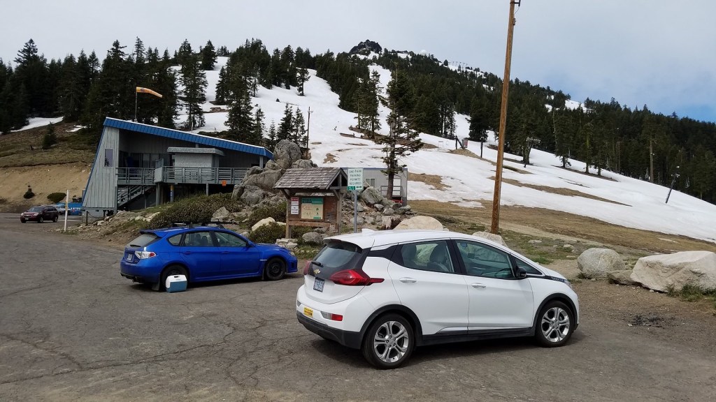 The gate was closed on Road 20 at the west end of the Mt Ashland Ski Area, so we parked a couple of hundred feet east of it, in a spot I judged would have shade when we got back to the car, and walked the road toward Grouse Gap. The road was plowed to the branch that goes to the summit of the mountain, and then up that branch; that’s for the people who service the equipment on top of the mountain, including a TV broadcast antenna and a weather radar dome as well as the upper terminals of a couple of ski lifts. At the junction, we chose to stay on Road 20. After the plowed part, the road was three to six feet deep in snow. Some of the time there were bare patches along the edges, and we could walk in those; at other times, there was no choice but the top of the snow, which luckily was fairly firm. Grouse Gap itself was covered with snow to a depth of about two feet. Weather was cloudy and cold when we started walking around 10:30, but had mostly cleared by the time we got back to the car five hours later, having walked a total of about 5 miles. The Bolt was in the ONLY small bit of shade in the very large parking lot, and yes, I felt smug.