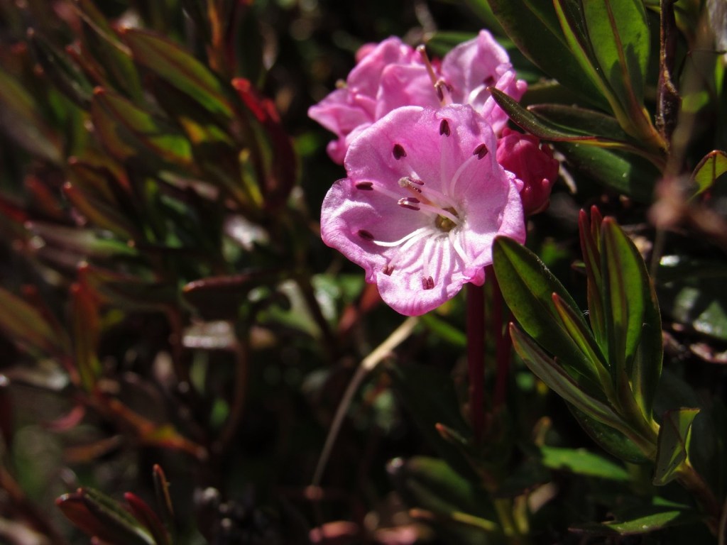 Walking in, the only things we saw in bloom were manzanita bushes, but I did spot some color in a large bare area up a south-facing slope above the road near the big bend in the road beneath the rock formation known as the Rabbit Ears, so we climbed the slope to investigate on the way back. The “color” was a large patch of mixed buttercups and marsh marigolds. They were accompanied by a few miniature white lomatiums, and not much else – except a tiny patch of kalmia, with two fully-developed blooms. We hadn’t seen kalmia on that part of the mountain before, so finding it was the highlight of the day.