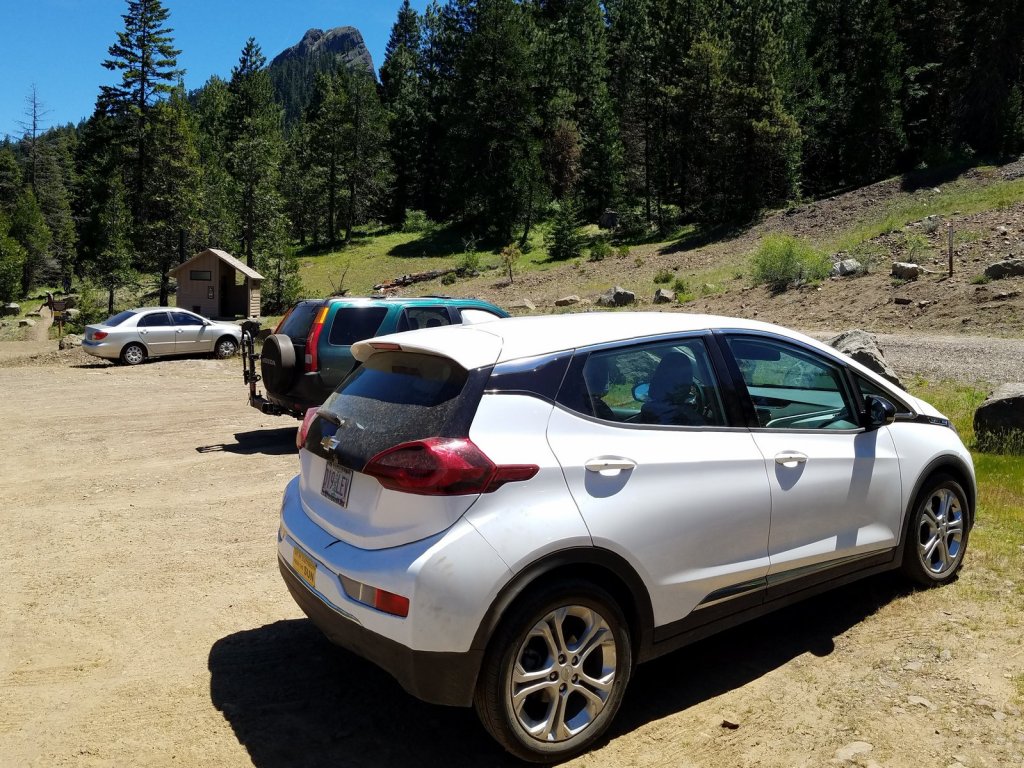 The Bolt at the Pilot Rock trailhead. We were grateful for the relatively high clearance of the car (7″) and the ability of electrical drive to precisely control the application of power to the drive wheels while crawling at very low speeds over a road that really needs to be improved if the public is ever expected to find the Cascade-Siskiyou National Monument.
