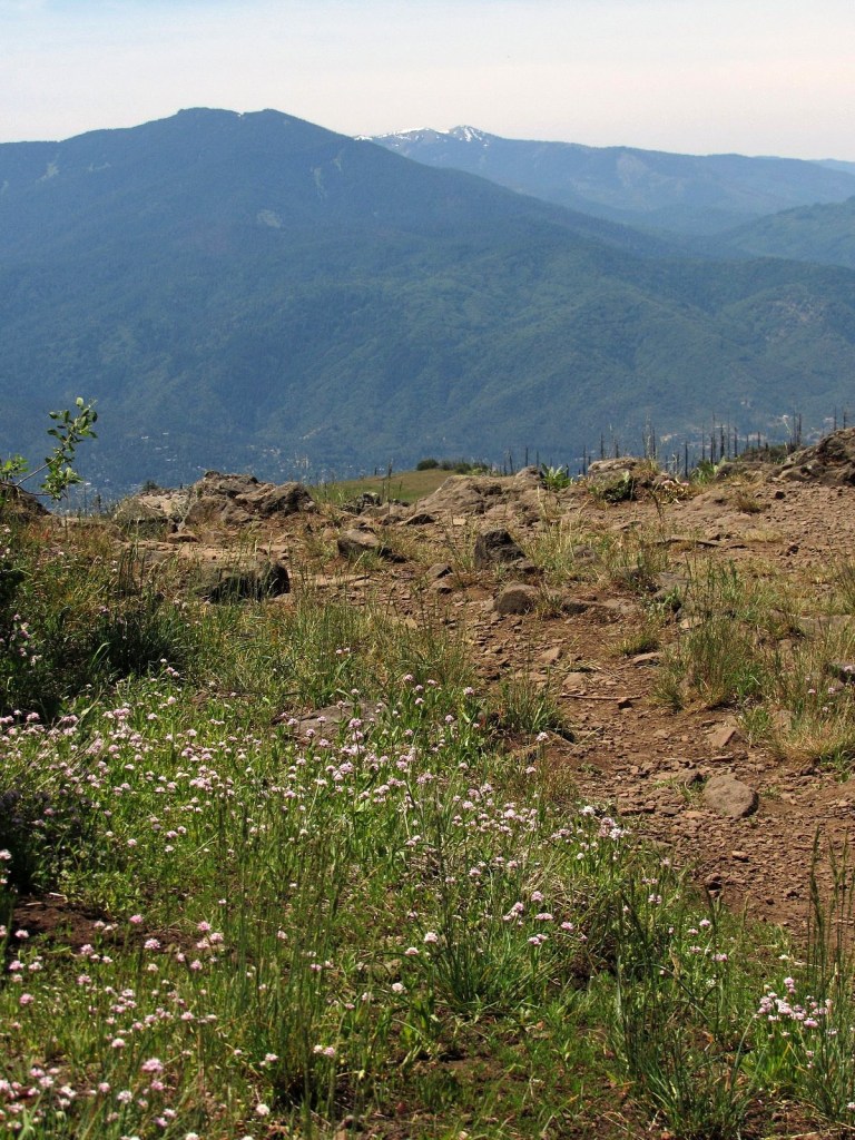 The hike itself took most of the rest of the day. The Grizzly Peak trail is a six-mile loop with a 750-foot elevation gain, most of it in the first mile, and as we age into our late 70s it is beginning to be a challenge. But it is worth it for the wildflower show. The trail begins in a verdant conifer forest, a northern-coast-range type forest of tall trees and rich green undergrowth, inexplicably transported to a mountain in the southern Oregon Cascades: then it traverses a loop around the edges of a high plateau covered with a graceful mix of forest and meadow. We took the loop counter-clockwise this time. Views opened out toward Medford and Roxy Ann, looking tiny and lost in an immensity of space. The scar of the 2002 Antelope burn held even more views, across green slanting meadows laced with wildflowers beneath the black snags of the burned trees, a sign that the forest is recovering well. The best view was saved for the far end of the loop. We climbed a steep hillside to the west summit, through paintbrush and balsamroot and fields of rosy plectritis, to cliffs that look out over hundreds of square miles of landscape. The view stretched from Mt Shasta in the south past Pilot Rock and the high peaks of the Siskiyous to the Rogue-Umpqua Divide in the north. A fine place to munch granola bars and contemplate how very, very small you actually are. And maybe wonder how Old Reelfoot might have felt, sitting in this very spot, 130 years ago.