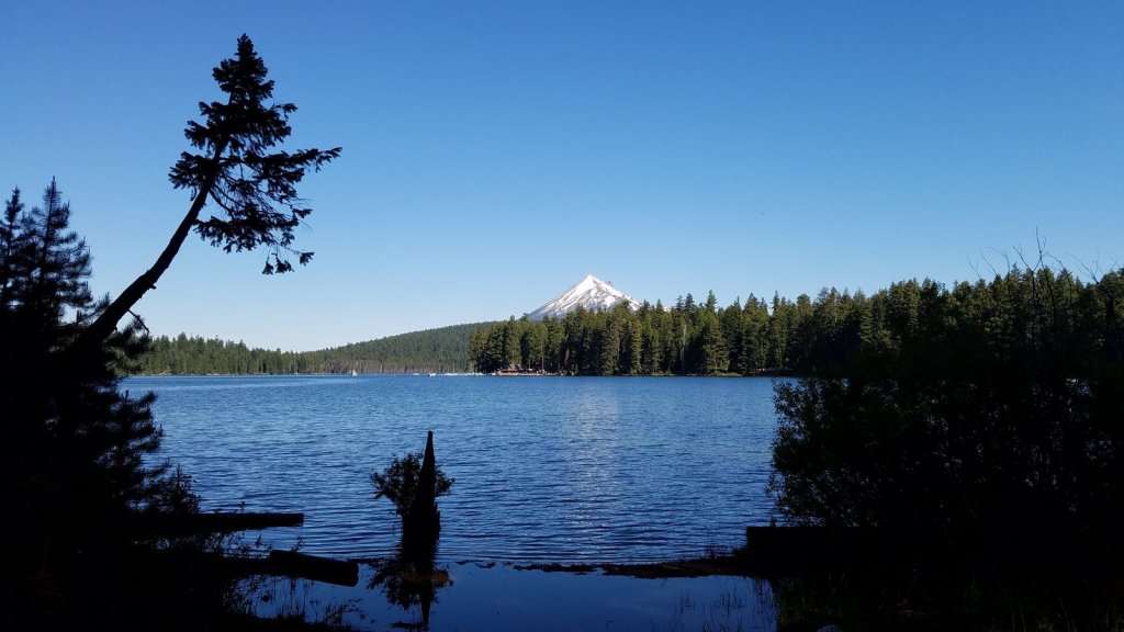 Then it was on to Grizzly down Dead Indian Memorial Road, named to honor three Native Americans whose bodies, dead from unknown causes, were found along its course in the mid-1850s (the settlers honestly thought they were being respectful). We stopped briefly by Lake of the Woods, where I walked the trail out along Rainbow Bay for some photographs of Mt McLoughlin across the water; then we didn’t stop again until we reached the Grizzly Peak trailhead, coming in by way of the upper end of Shale City Road, through an area we have long known as “Elderberry Heaven” for the great number of elderberry bushes that grow there beneath a glorious view of McLoughlin’s snowy cone. The road to the trailhead was in better shape than I’ve seen it for years; it didn’t even begin to challenge the Bolt’s considerable abilities as a backroads vehicle.