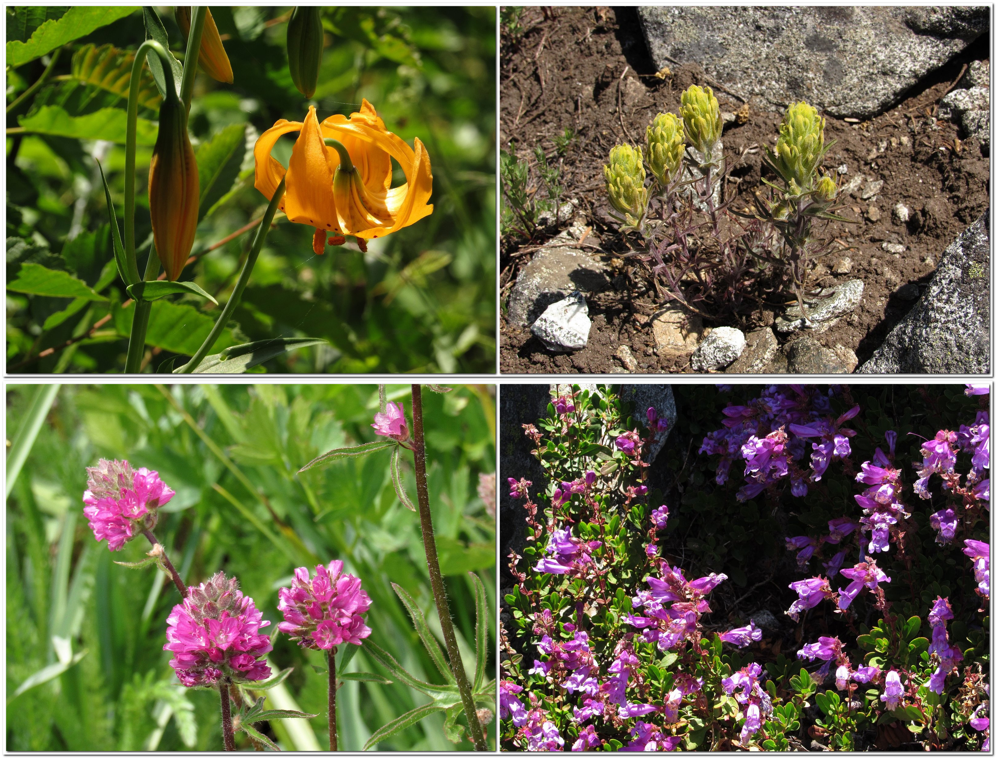 Clockwise from upper left: tiger lily, cobwebby paintbrush, Davidson’s penstemon, Oregon checker mallow.