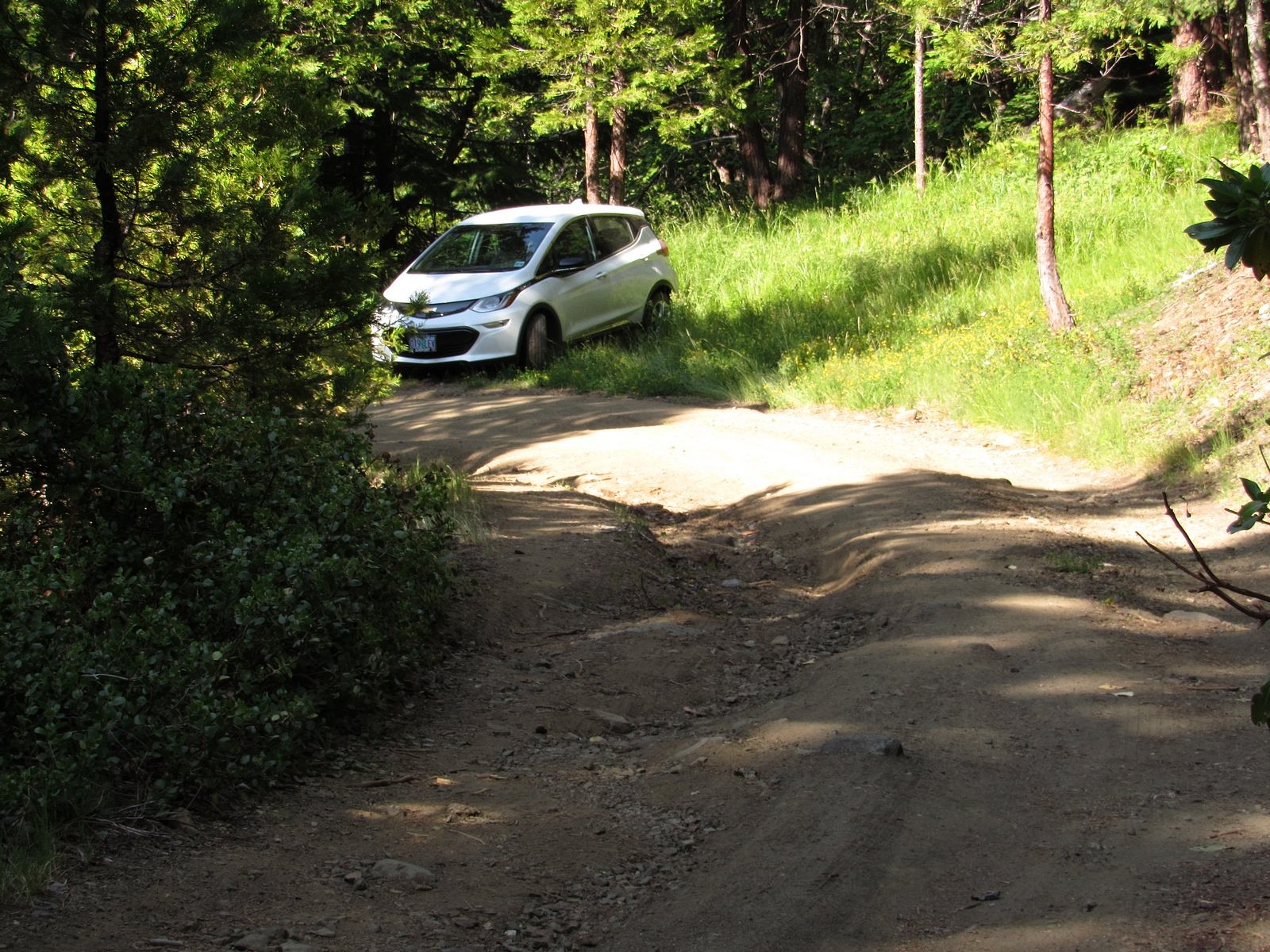 We didn’t quite get there – not in the car, anyway. Roughly half a mile before the road’s end, a fallen madrone had sprawled into the roadway. There was space to go around, but that space was occupied by a deep, rocky pothole followed immediately by a large rock. I had managed to work my way around all potholes and rocks until then, but I’d had the full width of the road to maneuver. This one looked impossible. So I backed the Bolt into a convenient flat area on a switchback 100 feet or so back down the road, locked it up, and we began walking. In fifteen minutes, we were on the trail.