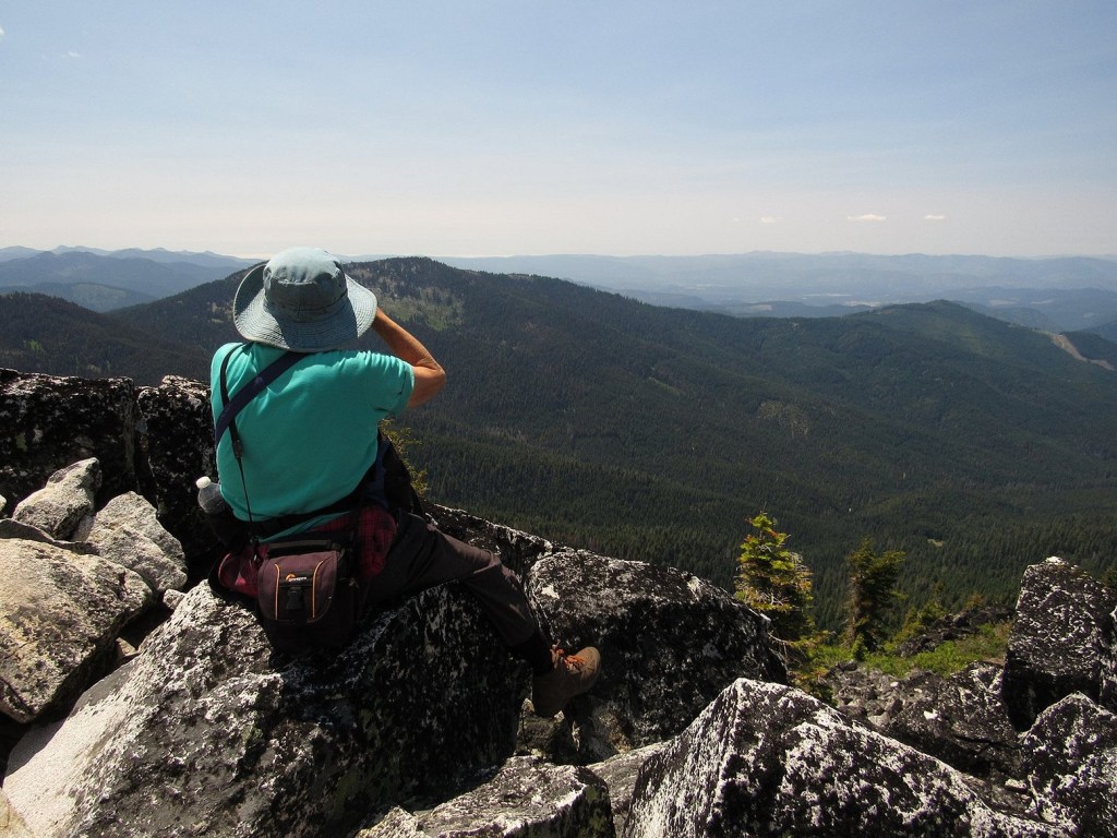 An hour later and two-thirds of the way up the meadow we hit the Boundary Trail, so named because it runs along the western and southern boundaries of the Rogue River National Forest, beginning at Windy Gap – a little over a mile north of where we hit it – and ending many miles away at Lily Pad Lake, near the eastern end of the Red Buttes Wilderness. We took the Boundary Trail south for a mostly level half mile to the mountain’s south ridge, left it, and started boulder-hopping up the ridge. An hour of that, and we were on top. On top of the world.