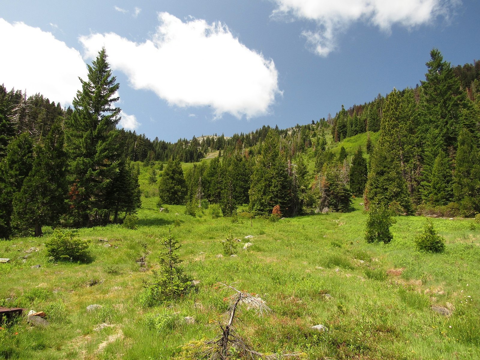 If I had to describe the O’Brien Creek trail in one word, it would be “brutal”. The trail, built long ago to supply a herders’ cabin in a large subalpine meadow in the Siskiyou Mountains, heads uphill abruptly from the trailhead and climbs 2000 thigh-challenging feet in two miles, all of it through dense, dark, mostly dry conifer forest. Not my normal idea of a good time. But it is also the best way to reach Grayback Mountain, and Grayback is definitely worth reaching. Grayback is the highest peak in Oregon’s Josephine County, and one of only a few Siskiyou summits to top 7,000 feet. The meadow spoken of a few minutes ago, Grayback Meadow, spreads up the bottom of a shallow bowl on the mountain’s steep east slope for nearly 1000 vertical feet – acres and acres of grass and little springs and wildflowers, edged by trees and capped by a lovely line of granite cliffs below the summit ridge. And from the summit, it is said, on a clear day you can see the ocean.