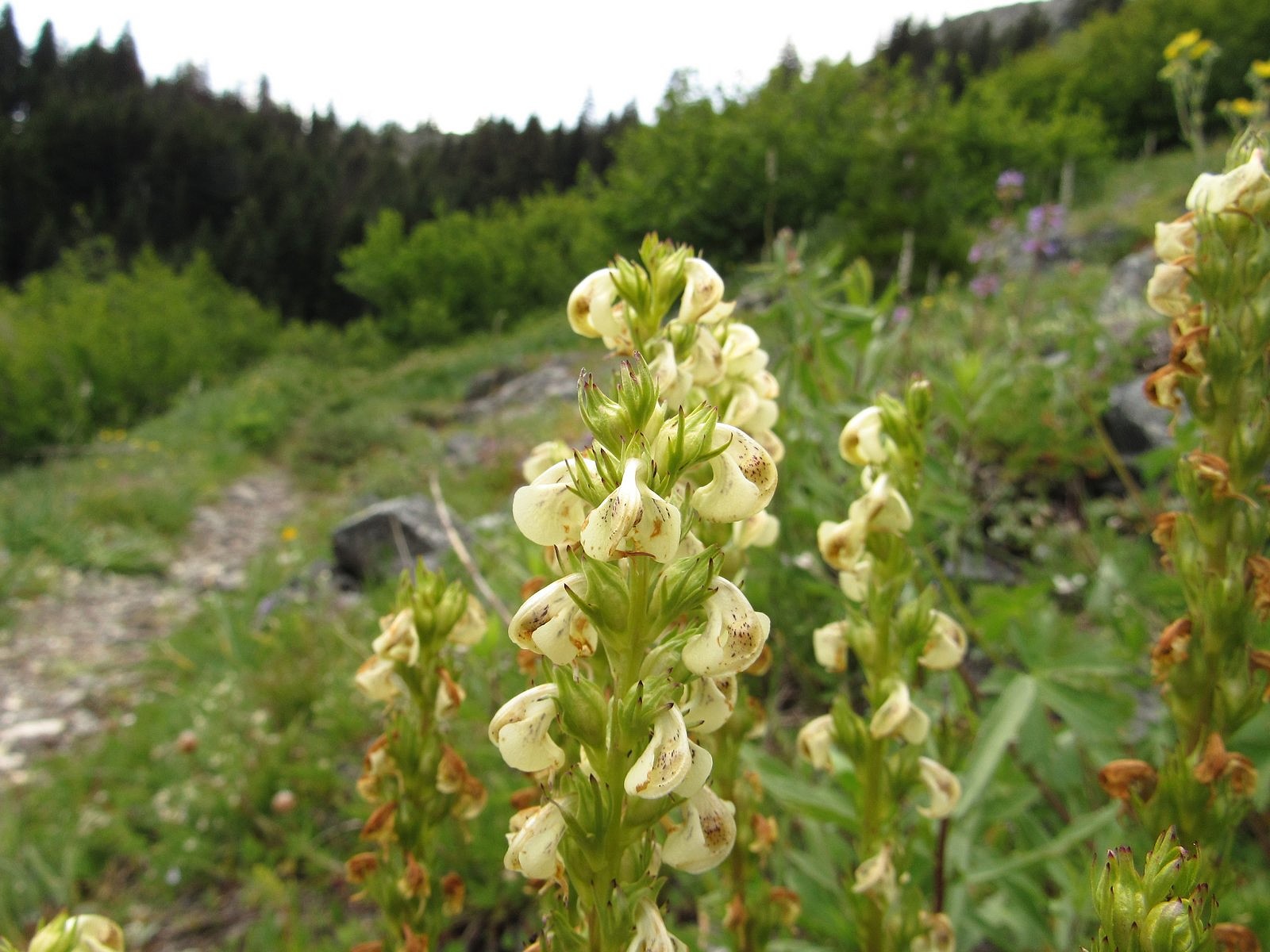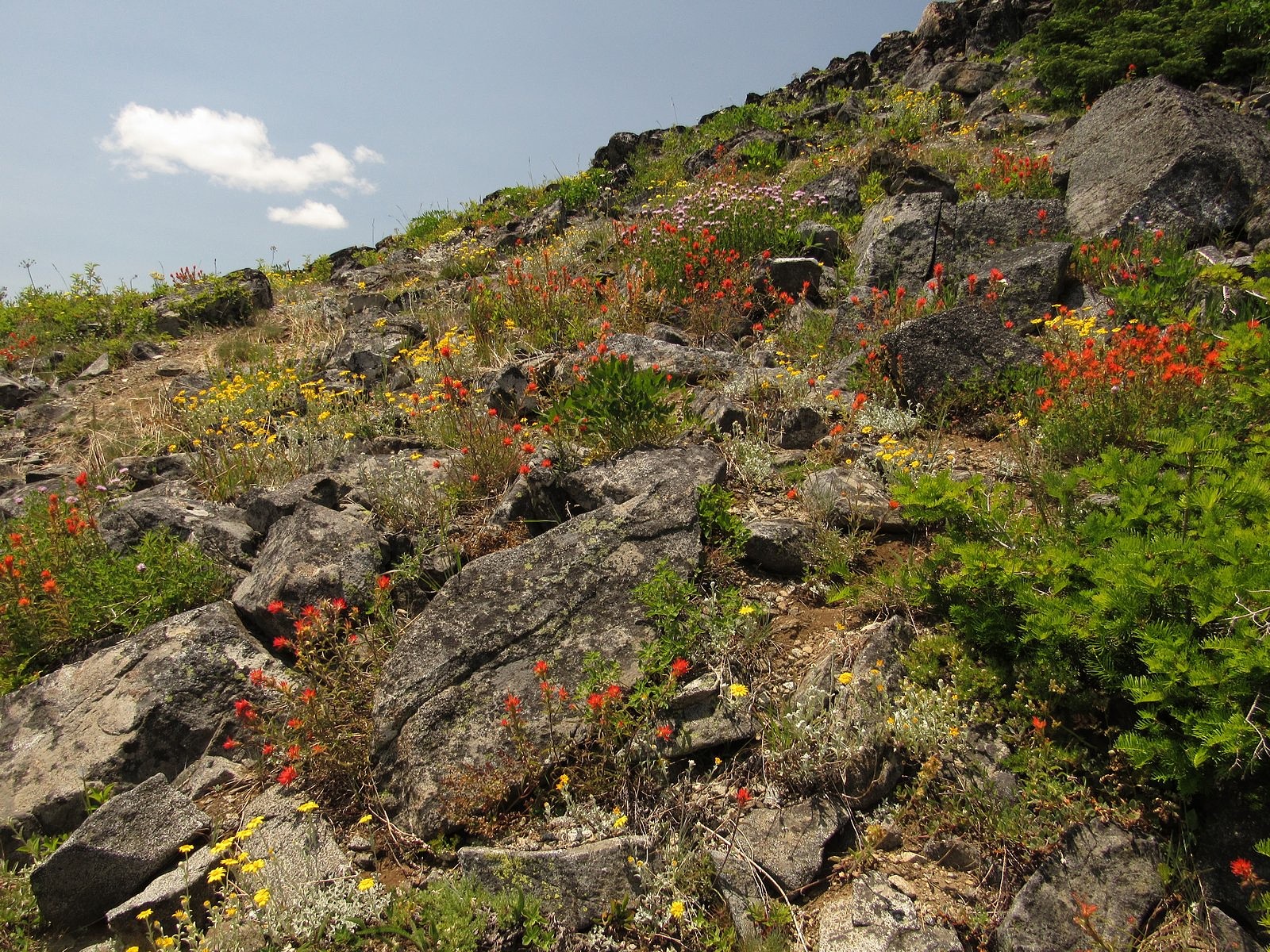 We moved slowly up the meadow, savoring. The slope was even steeper than the trail had been, but here there was sunshine, and the cliff far above us (but growing nearer), and views out that grew longer and vaster as we climbed. And nearly every square inch under our feet was covered with flowers. The Siskiyou Mountains are part of the larger Klamath Mountain system, which is mostly made of ultramafic rock – peridotite, serpentine, and their relatives – and ultramafic soils grow unusual plants. Grayback is actually made of granite, but it has its share. One flower, in fact – prolific here – is rare enough that it doesn’t appear in either of the standard wildflower guidebooks I use (see the accompanying photo). Others are Klamath Mountains endemics that would probably be happier on serpentine, but will also grow on granite. Add to those the standard mountain-meadow flowers you find everywhere in the west, and you begin to get the idea.