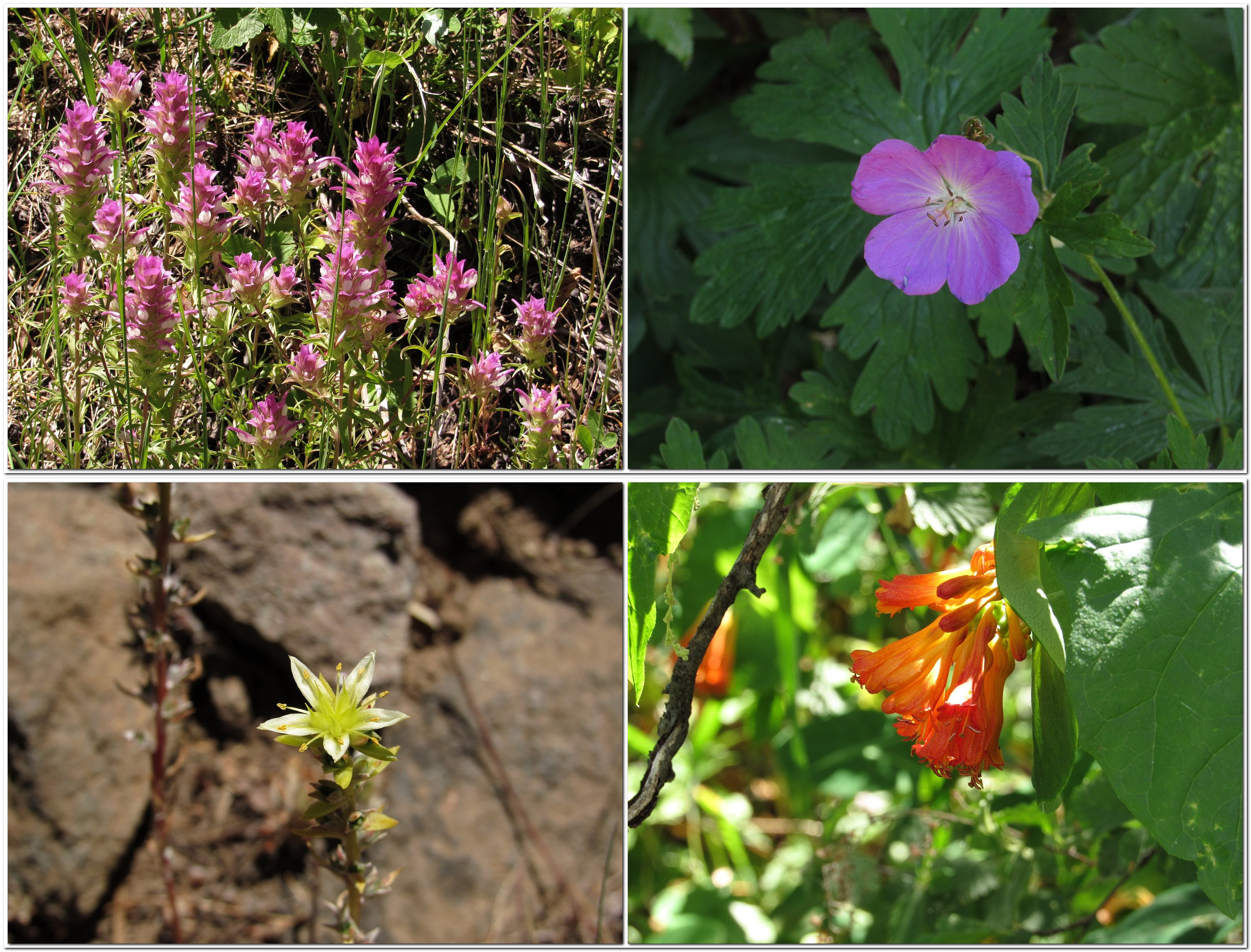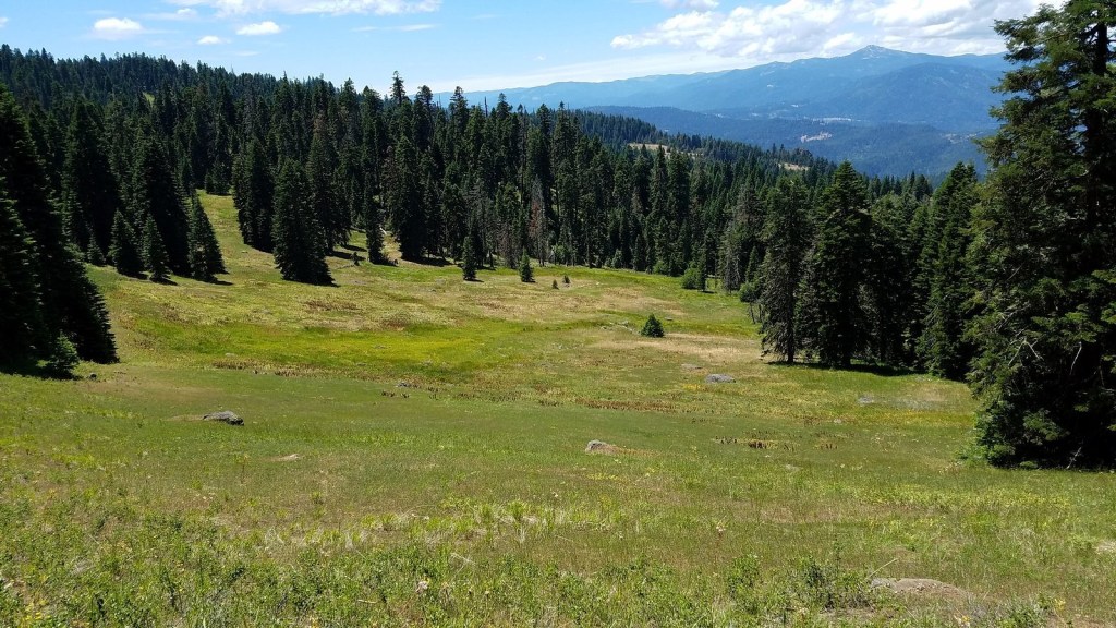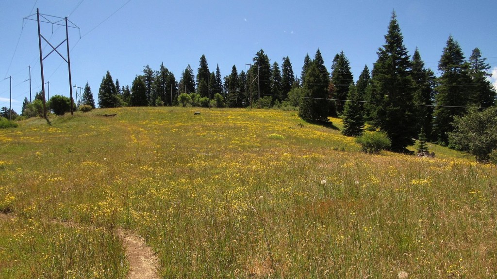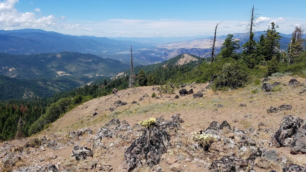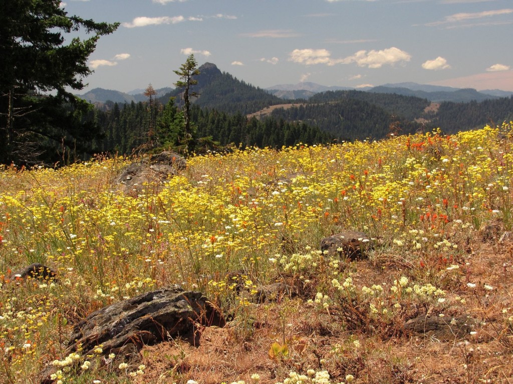 I promised a post on the hike I didn’t get around to blogging before we left town for a week, so here it is. It was a relatively short, relatively level walk on a stretch of the Pacific Crest Trail that traverses the northeastern slope of Soda Mountain near Ashland, Oregon. This section of the PCT is not known for its scenery – through-hikers usually just trudge through without stopping – but its mix of meadow and forest, with occasional views out to Ashland and the rest of the distant Bear Creek Valley, has a quiet charm about it. Streamlets abound in the meadows in early summer, and the mid-season flower displays can be spectacular, especially on one particular rocky knoll about a third of a mile in. It’s a great introduction to hiking in the the Cascade-Siskiyou National Monument for first-time visitors, and a relaxing afternoon stroll for old-timers like us who had just recently made the much stiffer climb up Grayback Mountain.