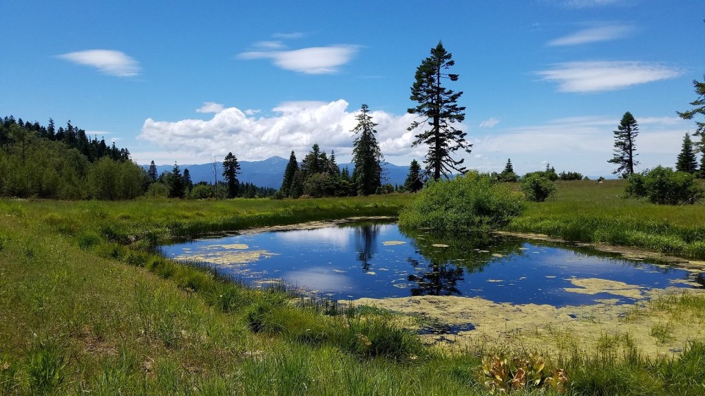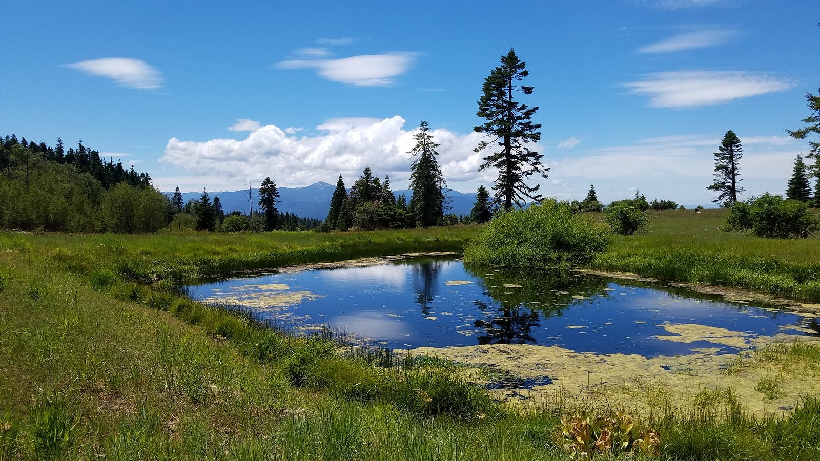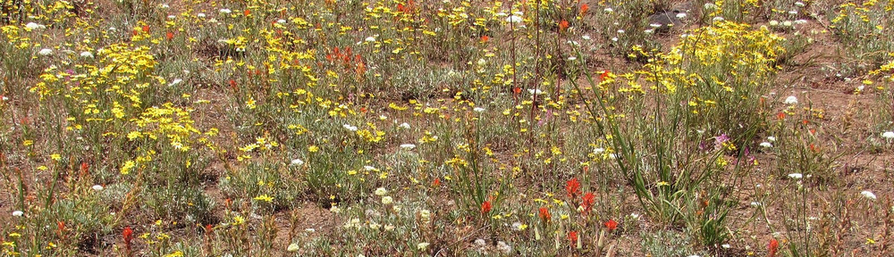 We parked the Bolt around 1:00 PM at the Hobart Bluff trailhead on the Soda Mountain Road, off Oregon Highway 66 at the Greensprings Summit, and headed south. The trailhead meadow was a yellow carpet of woolly sunflower under power lines; the knoll was spectacular, with woolly sunflower, paintbrush, buckwheat, and many other flowers covering nearly every square inch of ground beneath big views down the valley. After that, the flower displays were quieter but still lovely: hyacinths, columbine, honeysuckles, and many other plants in the woods; yampah and owls clover in the dry meadows; monkeyflowers and heals-all near the one small pond the trail passes in this stretch. We turned around at the saddle under Little Pilot Peak, a little less than three miles in, where there is a nice view south to Mt Shasta.