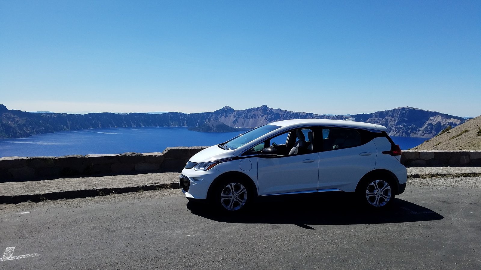 This particular trip was primarily planned because smoke from the Milepost 97 fire near Canyonville, Oregon had made the air unhealthy in many of the places we usually go, but had largely bypassed Crater Lake. But I’ve also been wondering, ever since we got the Bolt, how it would fare on a full Crater Lake day. We’d taken it to the Rim Village overlook and back (see https://drivingonsunlight.net/2019/05/06/the-story-so-far/), but the park includes much more than Rim Village. There is a road – Rim Drive – all the way around the rim of the caldera that holds the lake, with side roads to several other points of interest, including one of the highest spots reachable by car in the entire state of Oregon. Since buying the Bolt in December, I’ve preached that an EV is perfectly adequate for all uses anyone would normally put a car to. Taking Rim Drive its entire length, plus as many of the side roads as we could fit into one day, would add many extra miles over our previous visit; but for outdoor enthusiasts such as us, it would certainly qualify as “normal use”. How would the Bolt’s battery hold up?