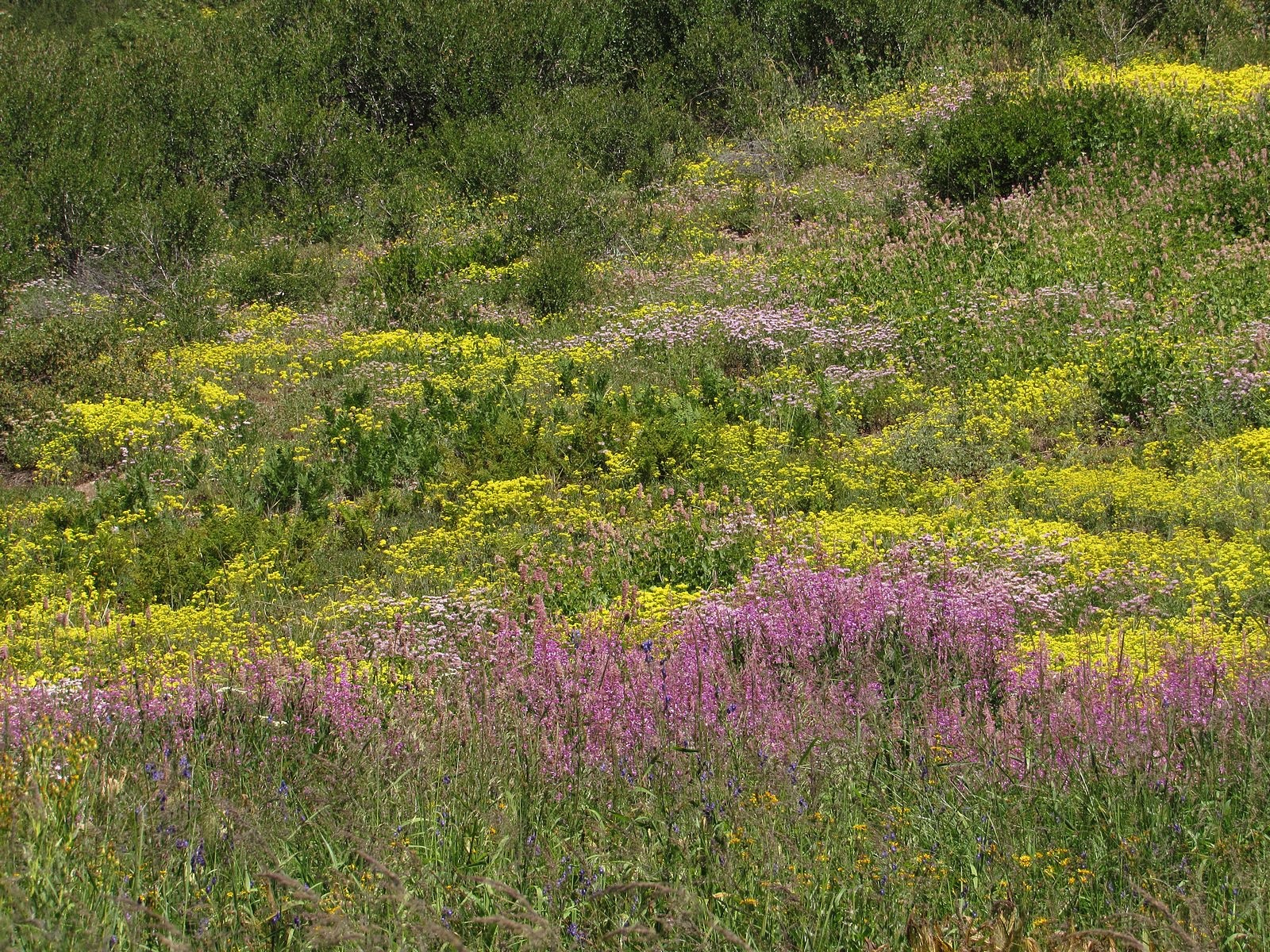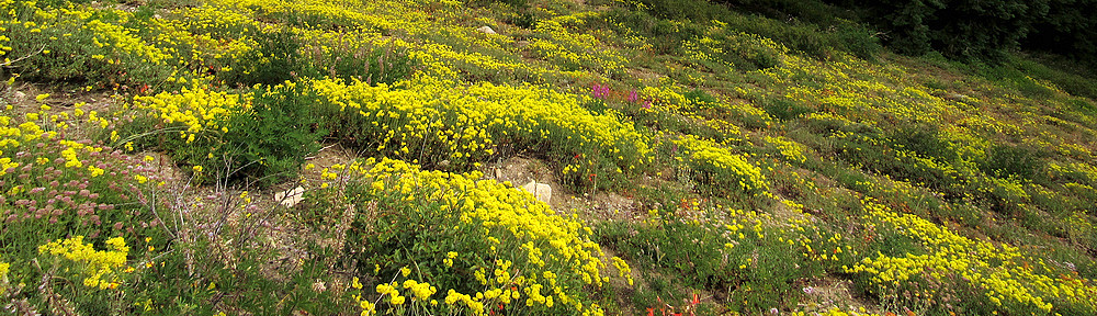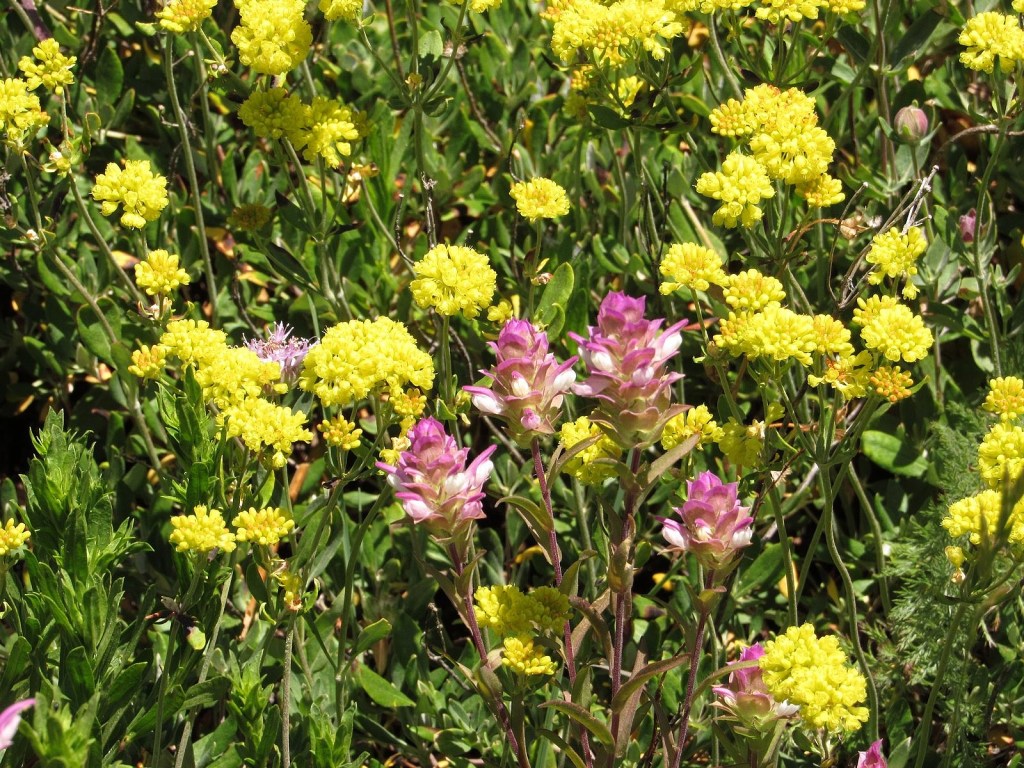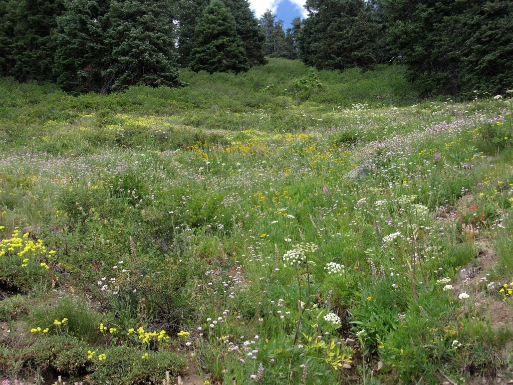 There is not much to say about the actual hike. We left Medford under a heavy overcast that was expected to get heavier, so it was a surprise to find the mountain basking beneath blue skies decorated by little puffy clouds. We parked the Bolt at the Mt Ashland Campground, dropped down the hill to the Pacific Crest Trail, and followed it around to the trailhead just off Road 20 in Grouse Gap; from there we climbed cross-country to the long, rocky ridge that juts west from Mt Ashland at the Rabbit Ears – picked up the mountain-bike trail along that ridge – took the trail back to the Mt Ashland summit road – and walked the road back to the car. Total distance was a bit over three miles, not much by our standards. The flowers on the ridge were disappointingly far past peak (remember what I said about different habitats?). The flowers in the Grouse Gap meadow system were….well, prepare yourself, and then check out the pictures.