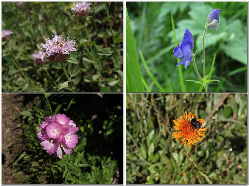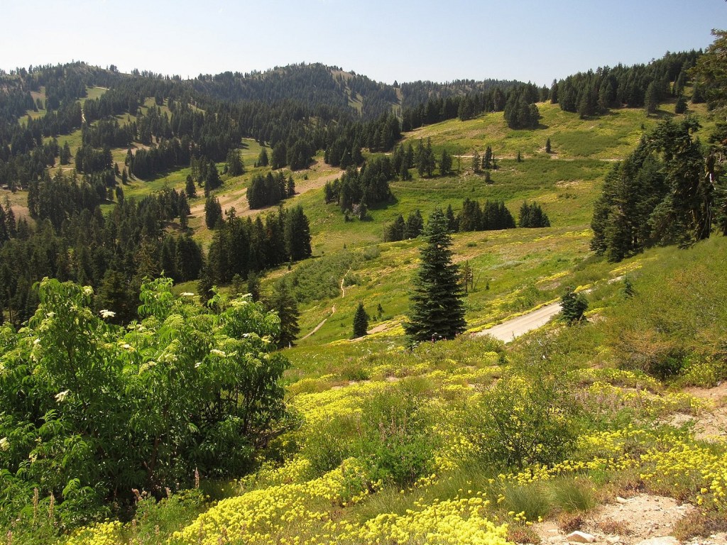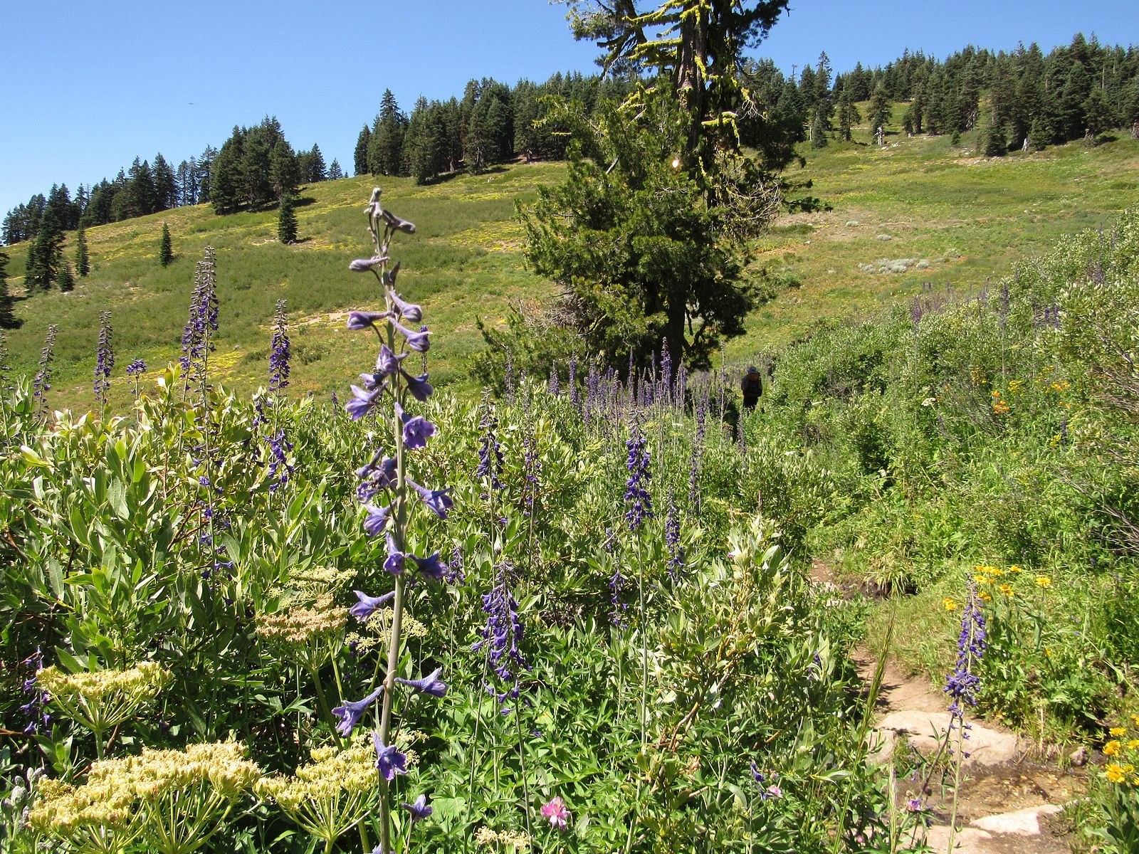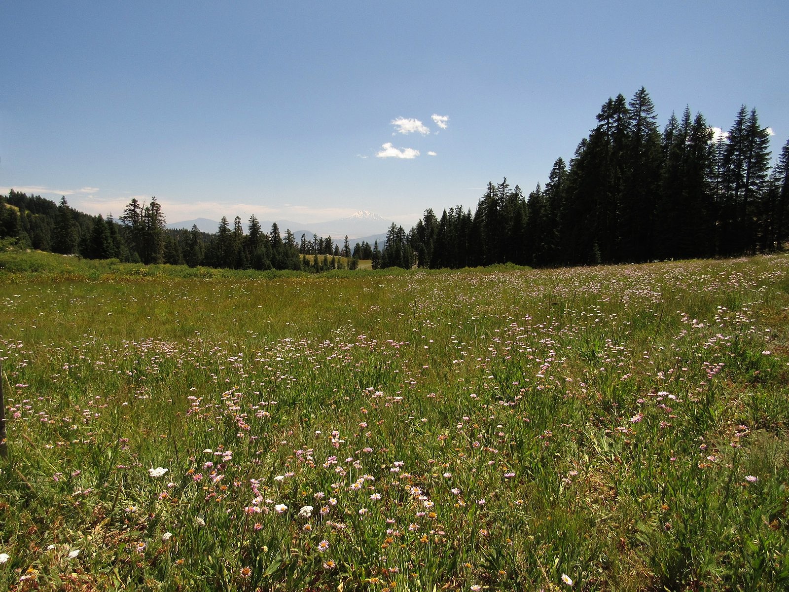 There is not much to say about the actual hike. We left Medford under a heavy overcast that was expected to get heavier, so it was a surprise to find the mountain basking beneath blue skies decorated by little puffy clouds. We parked the Bolt at the Mt Ashland Campground, dropped down the hill to the Pacific Crest Trail, and followed it around to the trailhead just off Road 20 in Grouse Gap; from there we climbed cross-country to the long, rocky ridge that juts west from Mt Ashland at the Rabbit Ears – picked up the mountain-bike trail along that ridge – took the trail back to the Mt Ashland summit road – and walked the road back to the car. Total distance was a bit over three miles, not much by our standards. The flowers on the ridge were disappointingly far past peak (remember what I said about different habitats?). The flowers in the Grouse Gap meadow system were….well, prepare yourself, and then check out the pictures.