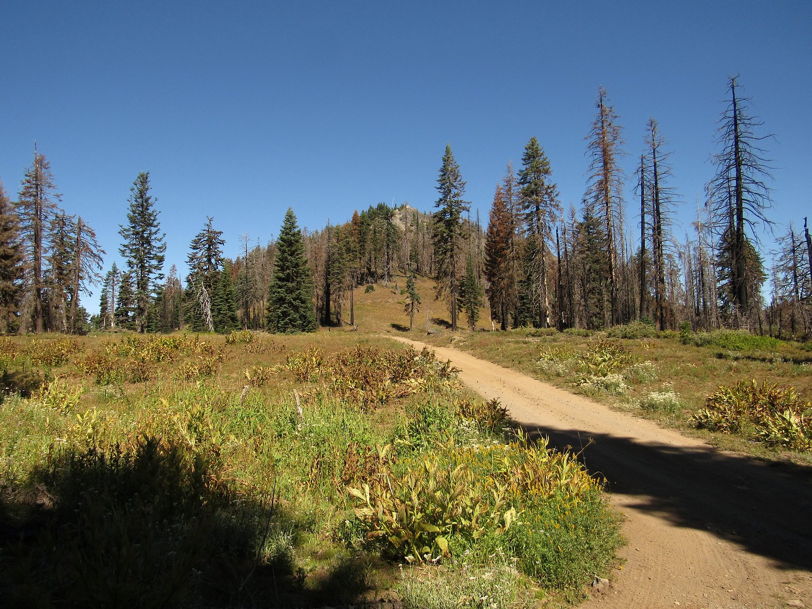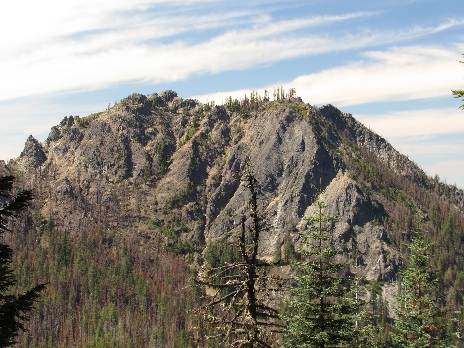 We reached the trailhead around noon. Two trails begin here: the Ackerman Divide Trail, which drops steeply into a meadow called Pup Prairie, and the Rogue-Umpqua Divide Trail, which stays more or less level for two miles before plunging into a cirque named, aptly, Hole-In-The-Ground. We had been planning Pup Prairie, but in our already-tired condition, more or less level won out. We took the Rogue-Umpqua Trail through the burned-over woods for a mile and a half, far enough to get a good view of the impressively rugged hulk of Highrock Mountain. A quick scramble to a ridgetop meadow – which yielded no views – and we headed for Beckie’s. We arrived home several hours later, with 141 new miles on the odometer and just under half the battery still available.