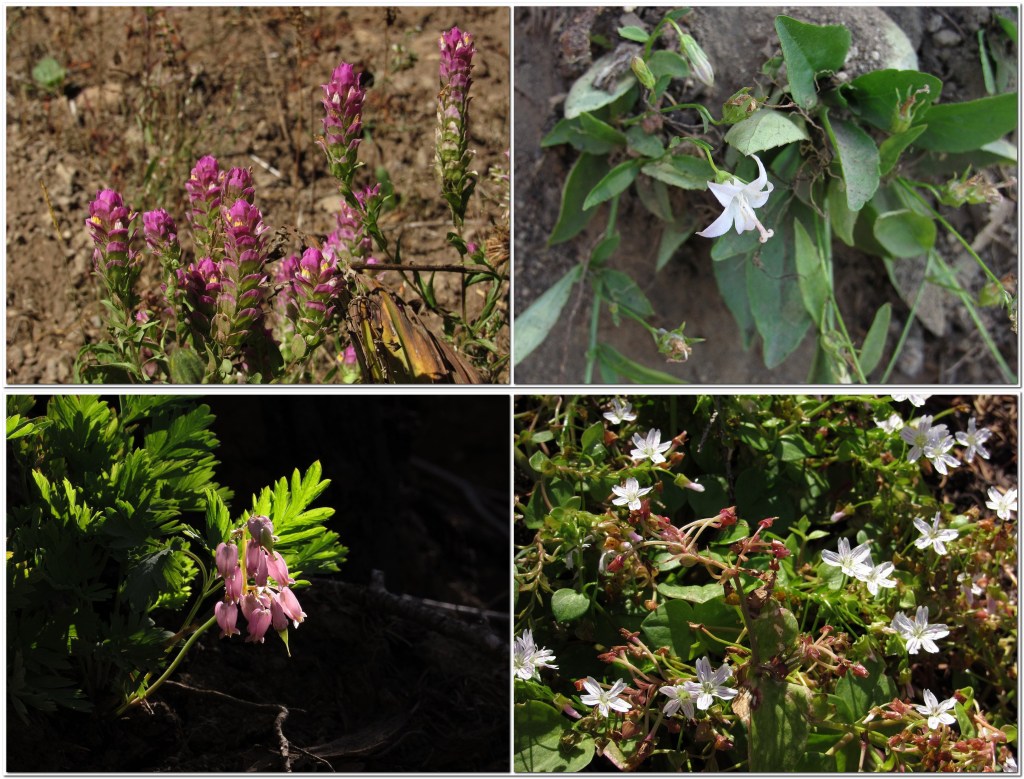 The Prospect ranger had told us that the walk along the road to the Ackerman Divide trailhead, which we intended to use, would be about a mile. It was a very long mile – nearly two miles, it turned out, when we checked the distance later at home. The Pup Fire had turned the forest around the mountain and its meadows into a mosaic of burned and green trees. The flowers, as expected, were mostly past, but there were remnants here and there of the glory that must have been present a month ago, including one very special find: Mazama collomia, a rare endemic that is found only in Crater Lake National Park and just a few other places within a 30-mile radius of the lake.