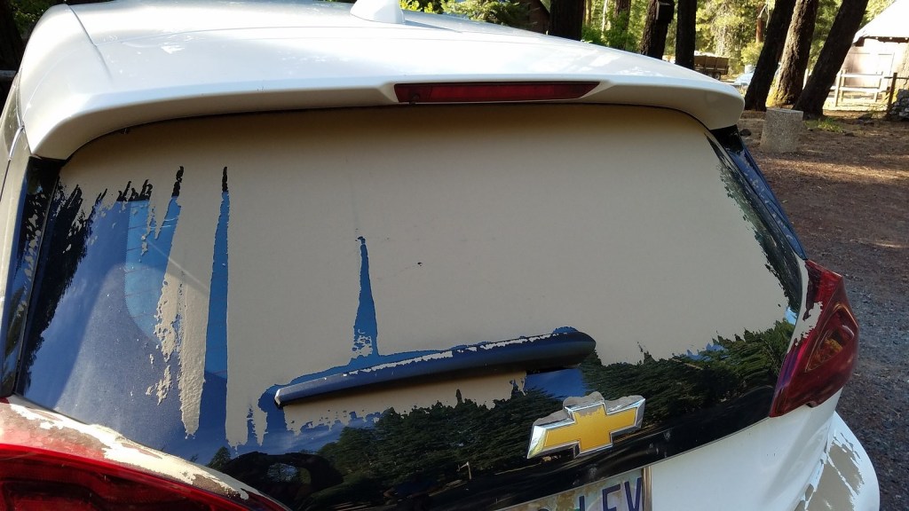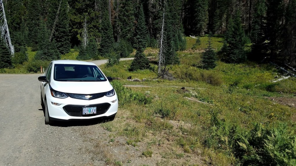 As we backed out of the driveway, I noted that the Bolt’s range indicator was estimating 347 miles. Comforting, even though I knew the real world wouldn’t give us that much. We turned onto the Hershberger Mountain Road around 9:20 AM, and after a brief stop along the Rogue near the road’s beginning and a somewhat longer stop at the base of the twin volcanic plugs known as the Rabbit Ears, we reached the turnoff to Road 530 – the spur off Road 6515 that leads to the Hershberger lookout – at 10:30. I turned onto 530, and immediately wished I hadn’t. We had been warned by the ranger at Prospect that this already-terrible road had been made much worse by the Pup Fire, a wildfire that had burned through the area in 2017, but I had hoped that, with the backwoods-driving skills I’ve honed over 60 years, I could ease the Bolt up it anyway. Within 150 feet, I knew that wasn’t going to happen. We would have needed at least a foot of ground clearance to make it across the ditches and exposed boulders in the roadbed; the Bolt has seven inches. Carefully – torturously – I backed out again. Even with the support of the backup camera, it took about ten minutes to cover those 150 feet backwards. I parked on the shoulder of 6515, on the edge of a lovely green meadow, and we started walking.