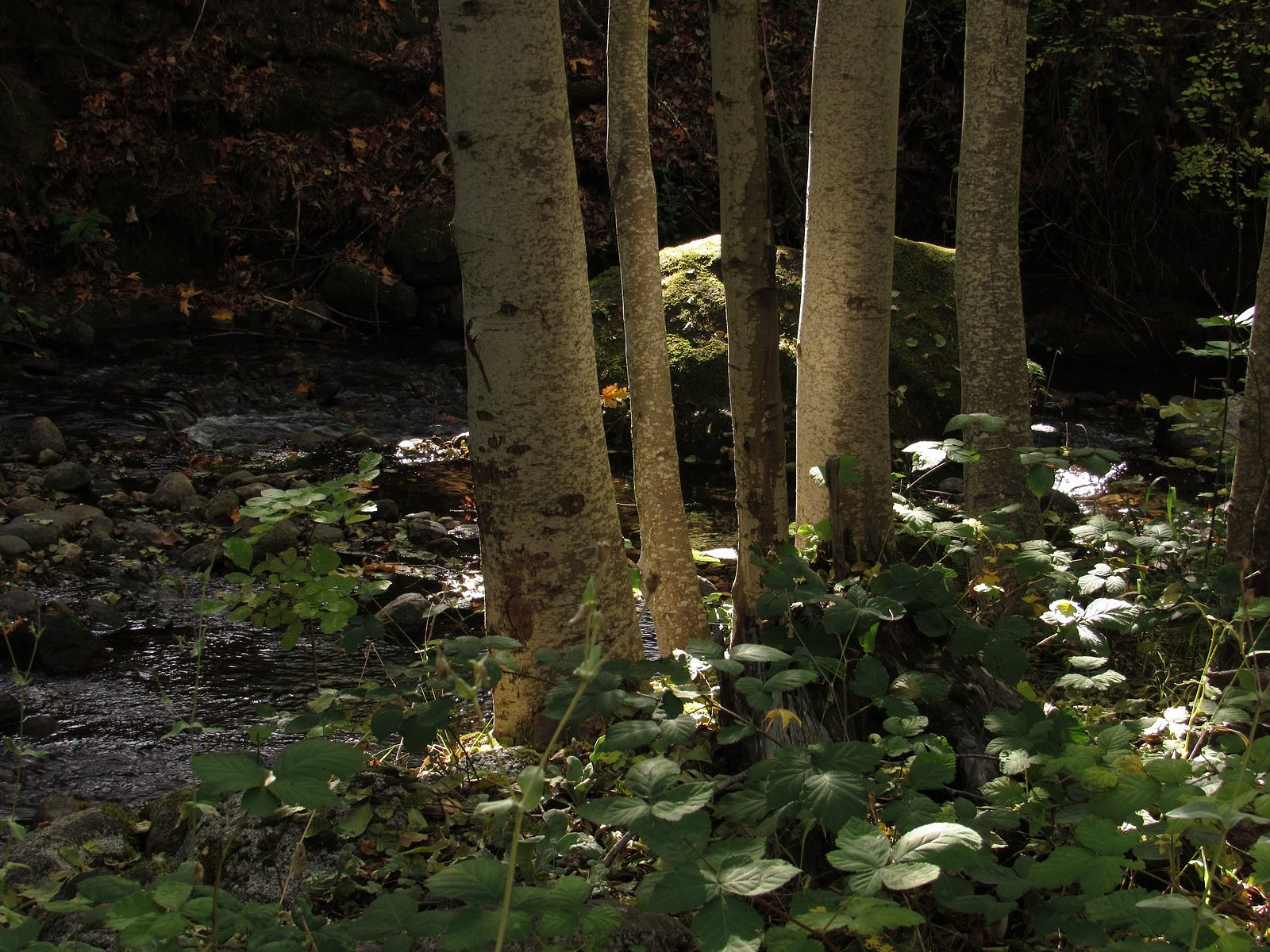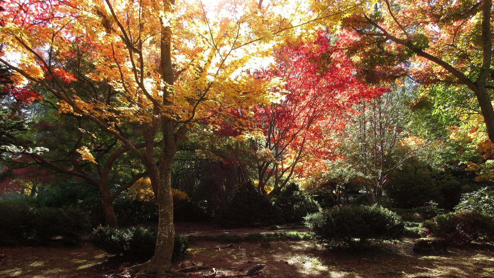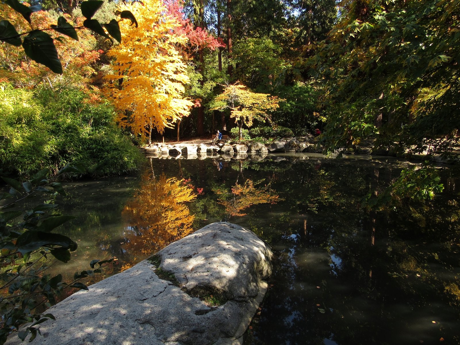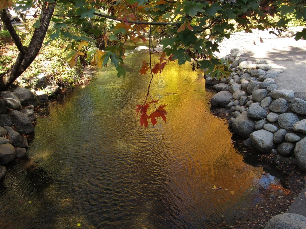 The subject this time is Ashland (Oregon)’s Lithia Park, which we visited on October 14, seeking fall color. Oregon’s forest trees are largely conifers, which don’t change color, so the seasonal color changes here are mostly found in street trees and city parks. Lithia Park is among the best of these, here or anywhere else: it was named one of America’s ten best public spaces by the American Planning Association in 2014. Its 93 acres, with landscaping designed by John McLaren – who also designed Golden Gate Park in San Francisco – offer delights any time of year, but particularly when the leaves are changing. The park is only 15 miles from our home, which barely makes a dent in the Bolt’s capacities, so you’ll find no electric-car stories here: just pictures. Enjoy this small bit of autumn in southern Oregon.