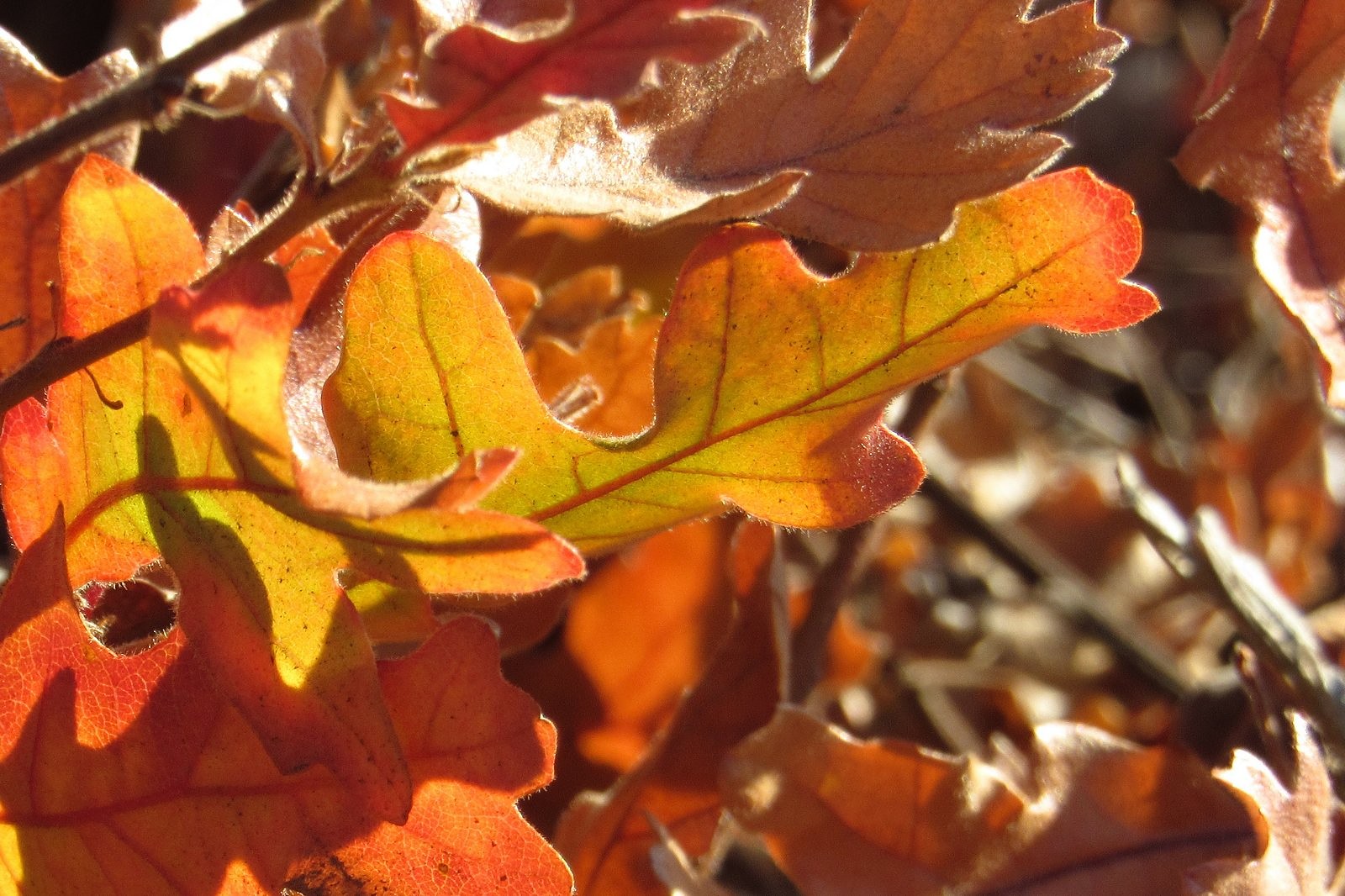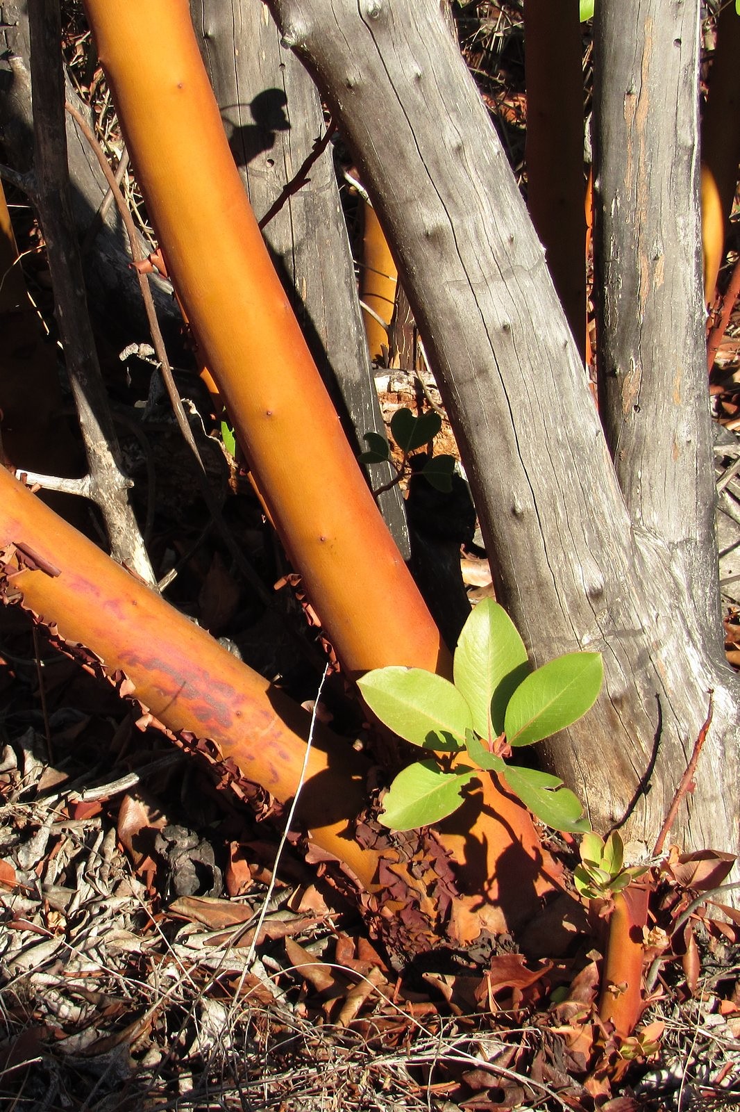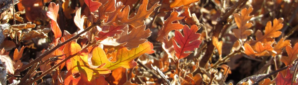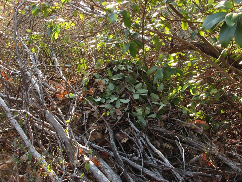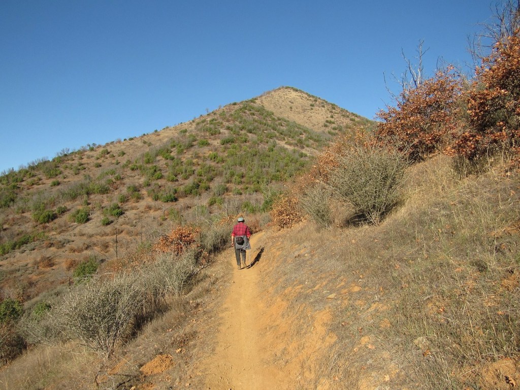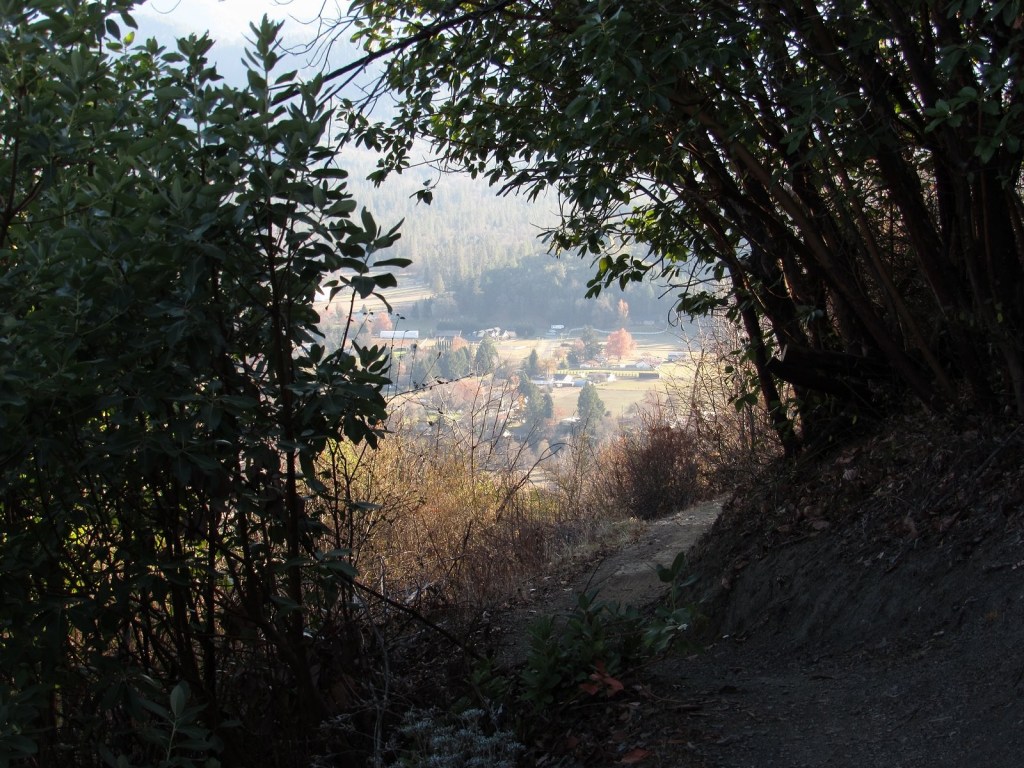A few pictures from our hike at the Mountain of the Rogue BLM recreation area near Rogue River last week. This is a new trail system, built in 2015; it’s primarily designed for mountain bikes, but hikers can use a few of the trails. The main trail goes all the way to the summit of Tin Pan Peak – a 1300′ elevation gain from the trailhead in a little under four miles. We’re saving that for another day. Today we were just checking out the area, so we stopped at about 850′ above the trailhead, at the intersection of the Rat Pack and Breakdown trails, about 2.5 miles in. No flowers (I understand there are plenty in the spring). There was some nice color from some of the young oaks, and we saw several woodrat nests.  Nothing much else to say: enjoy the pics (and scroll to the bottom for a link to something else new).