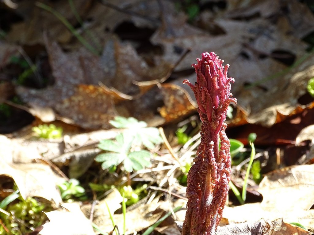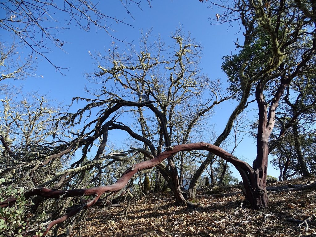 The weather was still cool early this week, with nighttime temperatures dropping into the 20s, so we didn’t leave Medford until after lunch. Reveling in the sunshine, we avoided the freeway, staying on back roads for all of the 45-minute drive to Grants Pass. We entered Cathedral Hills through the Sky Crest trailhead, the northernmost of the area’s several trailheads, and my personal favorite. The parking lot was nearly full, but I was able to find a spot for the Bolt. We climbed into the woods via the Sky Crest trail, then turned east onto the Sky Crest Loop. (You approach the trailhead along Sky Crest Drive. Someone in Grants Pass really likes that name.) The Indian warriors showed up almost immediately, in large bunches but mostly immature; they are semiparasitic on the roots of members of the heath family, including madrones and manzanitas, which are common in the open mixed oak/madrone woodland that covers the Cathedral Hills.