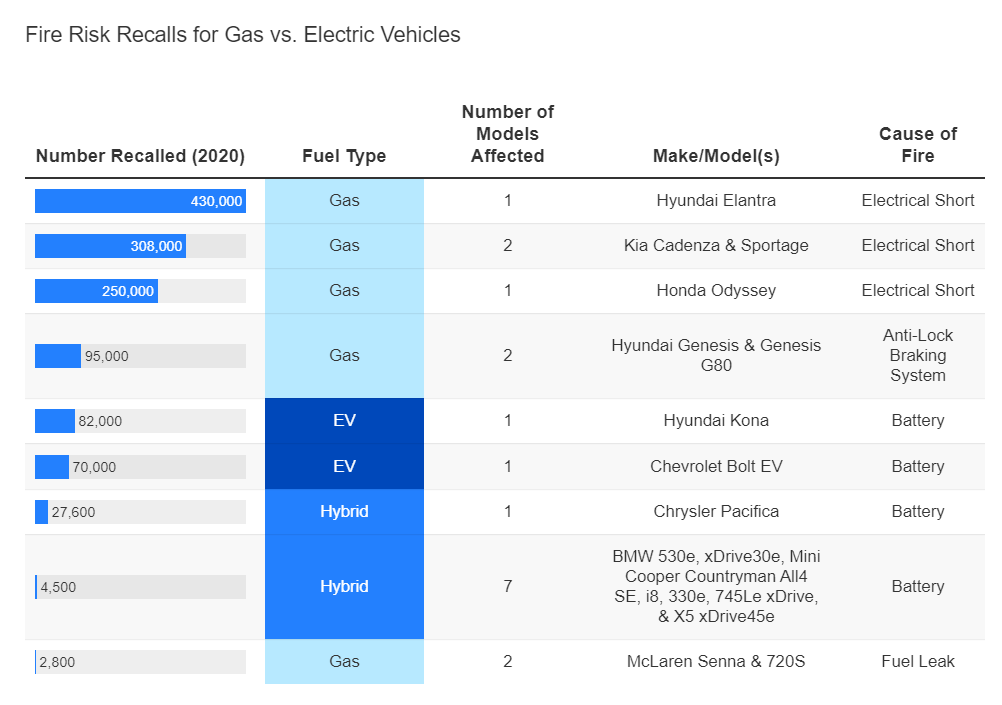 They also visited Recalls.gov to find out how many fire-related vehicle recalls had been reported to the government in 2020. Here is that data, broken down again by vehicle type: