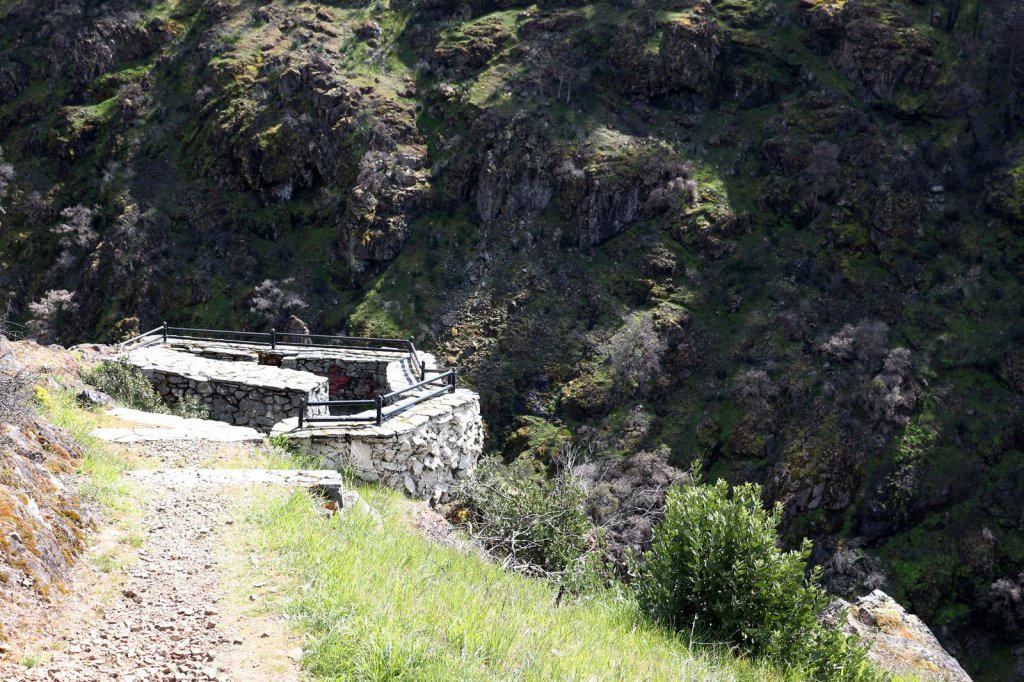 The road is paved, but it’s only about a lane and a half wide, so oncoming traffic must be passed with care. It climbs quickly up the mountainside, with glimpses across Taylor Creek’s valley to the tall waterfall on Schoolmarm Creek (no place to park for a photograph, dammit). In a little over two miles, you’ll see a small parking lot on the left. Pull in. A short trail here leads to the Taylor Gorge Overlook, a stone-and-concrete platform perched on the lip of the narrow, deep gorge through which Taylor Creek leaves its valley. It’s wild, and rugged, and the only certifiably spectacular scenery you’ll see on this trip. Enjoy.