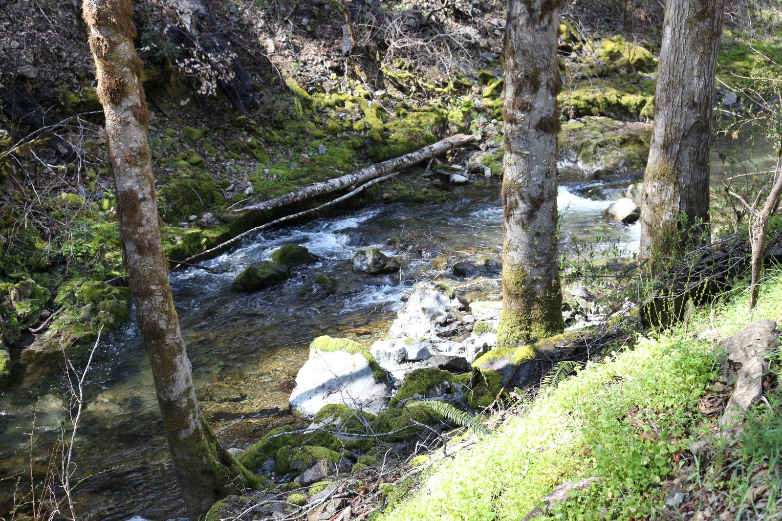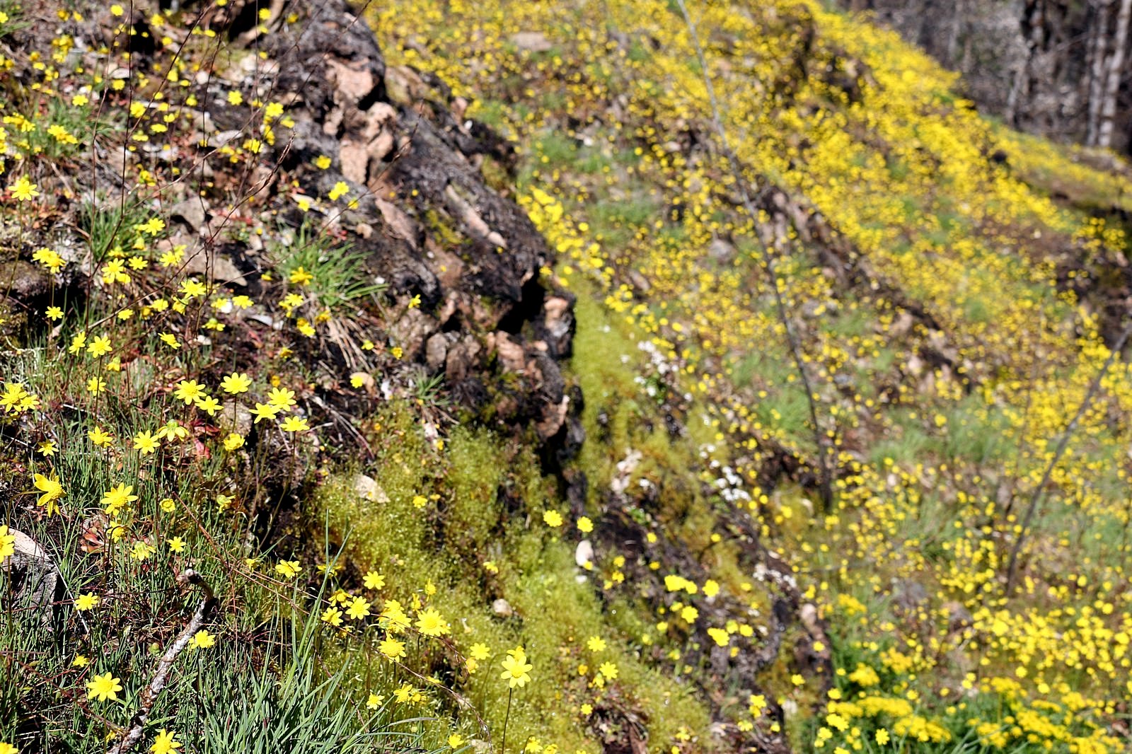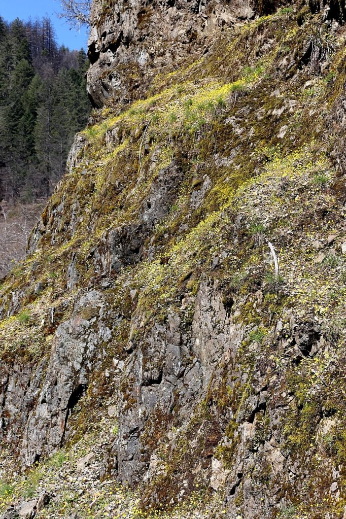 A bit beyond English Flat the road and the creek finally converge, and the quiet, intimate beauty of this out-of-the-way valley begins to show itself. The broad, limpid creek – one of the few places I know of where that overworked word actually fits – alternates between tumbling over rocks and flowing gently among alders. A small side-stream waterfall tumbles down a roadside cliff. A riot of spring gold (Crocidium multicaule, a small member of the sunflower family) spills over just about everything.
