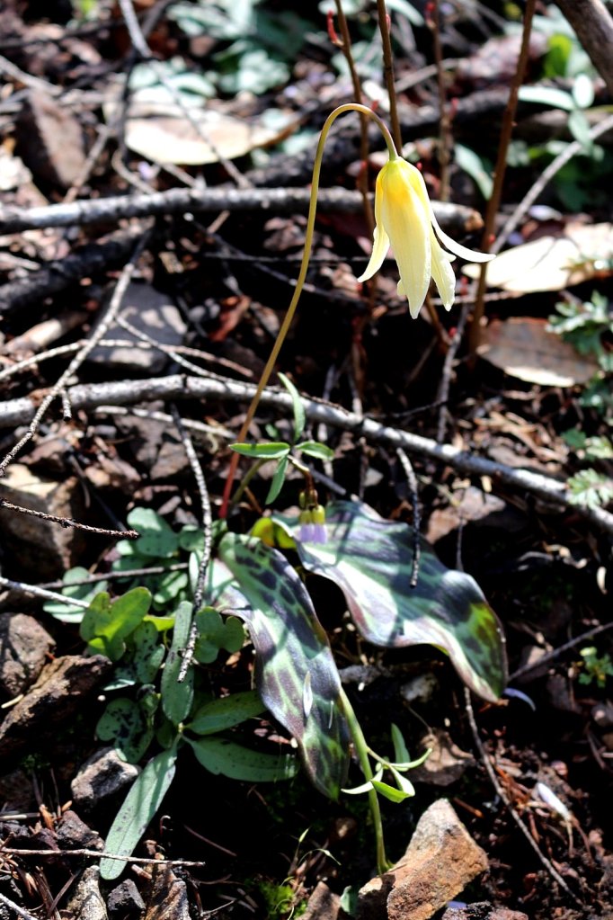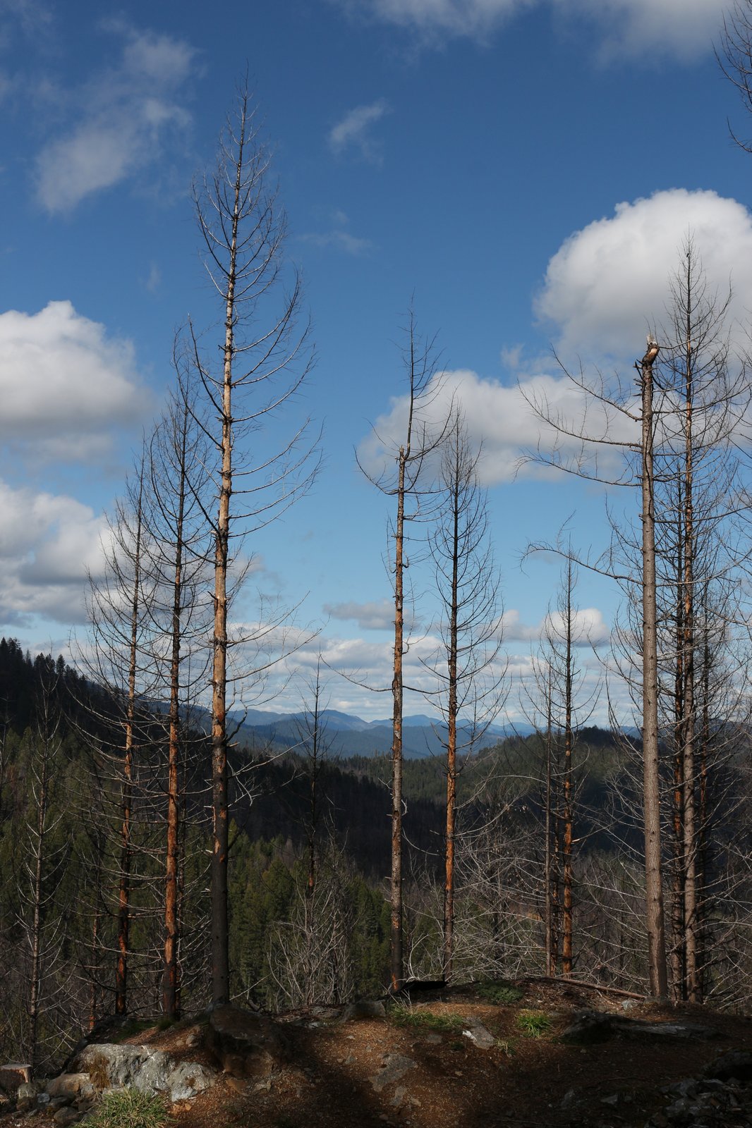 The rest of the day was anticlimatic, so I’ll keep this brief. Back on the trail, we crossed Burned Timber Creek a few dozen feet above the falls on a makeshift log bridge placed by the trail crews who cleaned up after the Klondike Fire and contoured up the steep hillside beyond. A mile or so from the trailhead, an unmarked but well-built trail forked off to the right: we followed it to the Burned Timber Creek Road and strolled down that to the point where we had begun, a couple of hours before. Back in the car, we drove south to Lone Tree Pass, stopping briefly at a small gorge near the mouth of Minnow Creek and again at a massive display of Oregon fawn lilies near the China Creek trailhead. The road to the pass narrowed for the last mile after leaving the creek, winding through the charred remains of one of the hottest burns of the fire; the pass provided views of green mountains through burned timber.