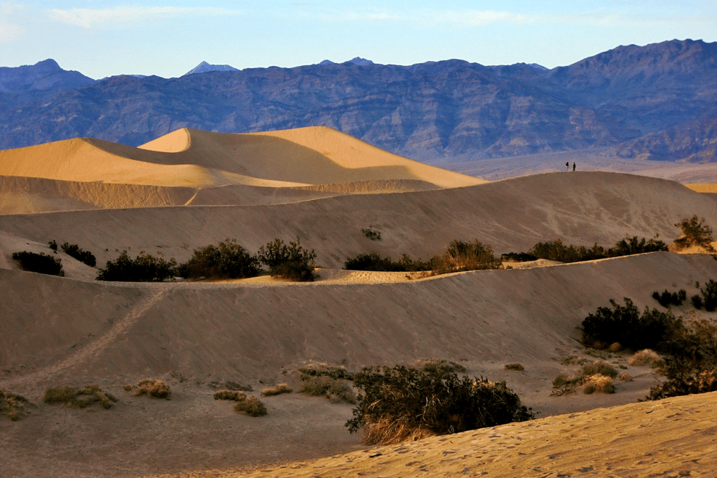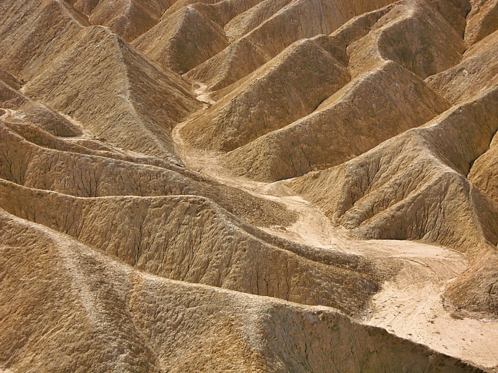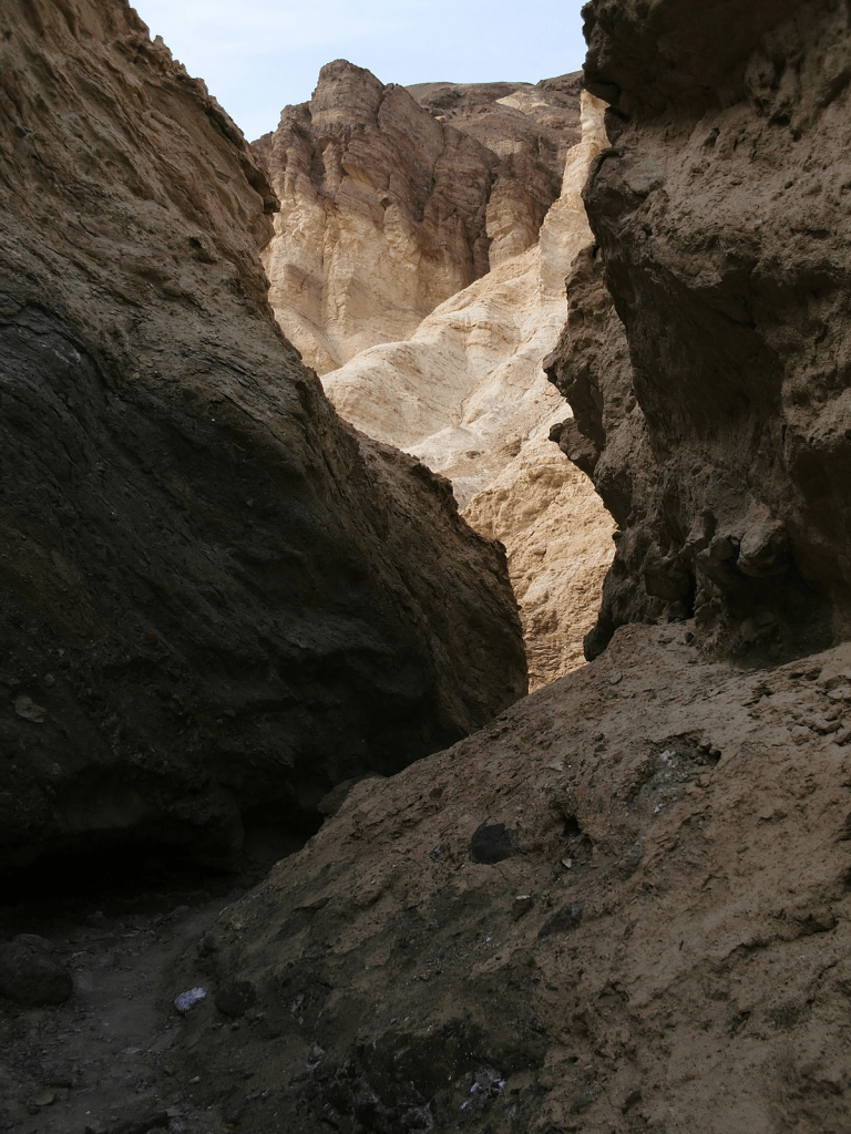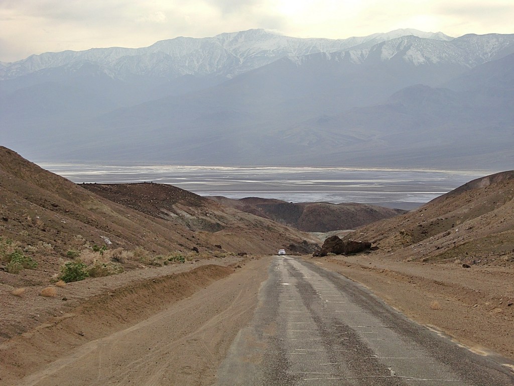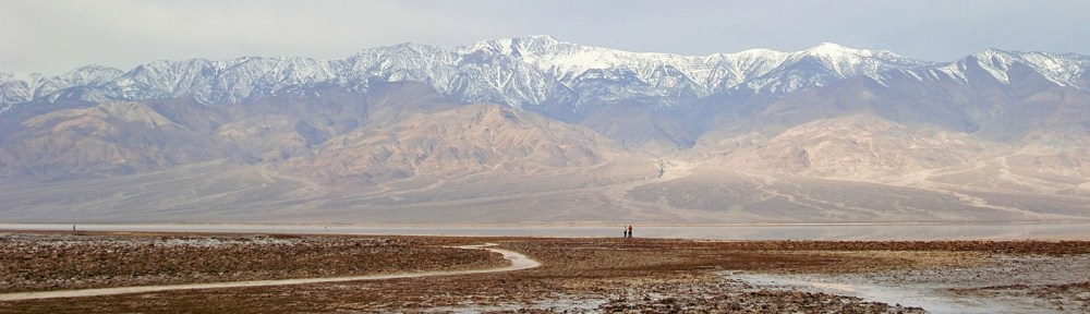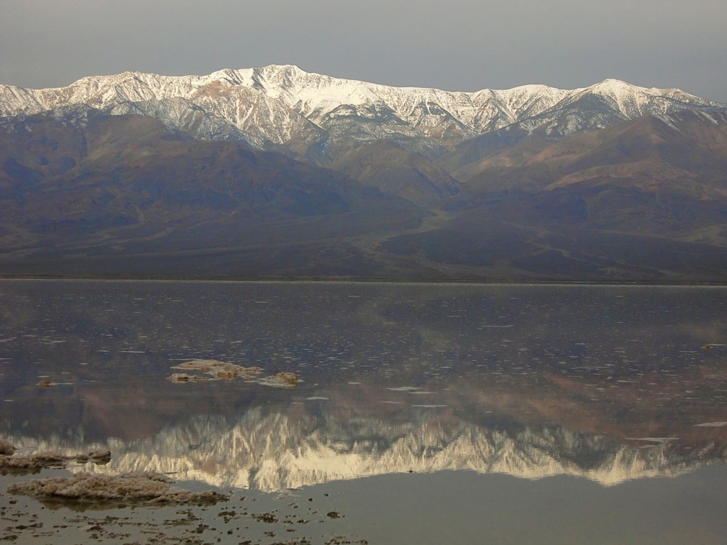 But if low, dry, and hot were all that Death Valley had to offer, it wouldn’t need to be a National Park. We could just fence off a few square miles of salt flats at Badwater, put up a plaque, and forget about it. What makes this park eminently worth visiting is not only its record-breaking extremes, but its incredible, otherworldly scenery – its dramatic slot canyons, its huge sand dunes, its technicolor mountains, and above all, its contrasts. Standing at Badwater and looking west across the salt flats, what you will see is the tall blue wall of the Panamint Range, topped by 11,043-foot Telescope Peak – close enough to the flats that it casts a shadow across them every afternoon. That peak is in the park, too. Few places anywhere have elevations so different in such close proximity to each other.