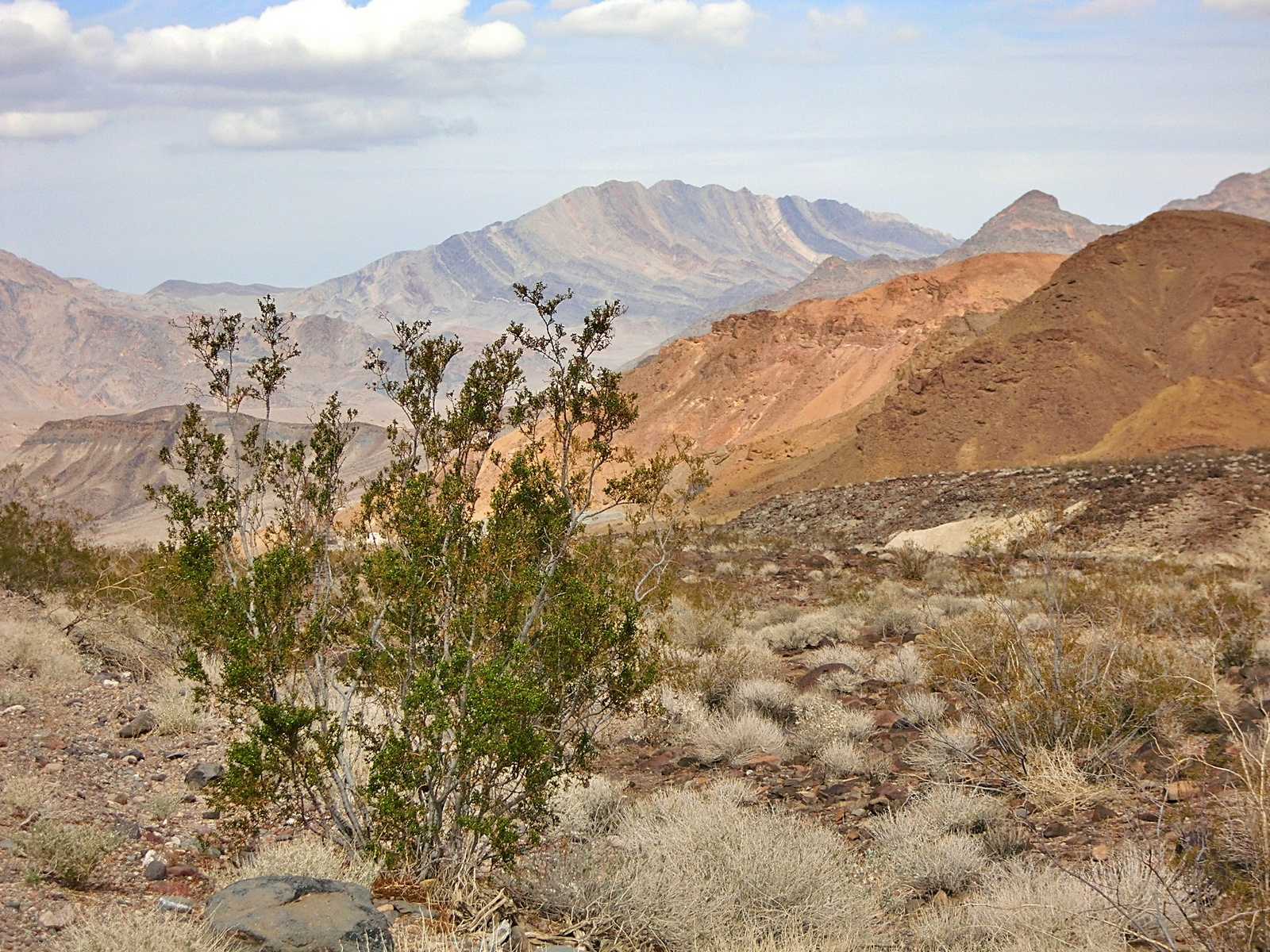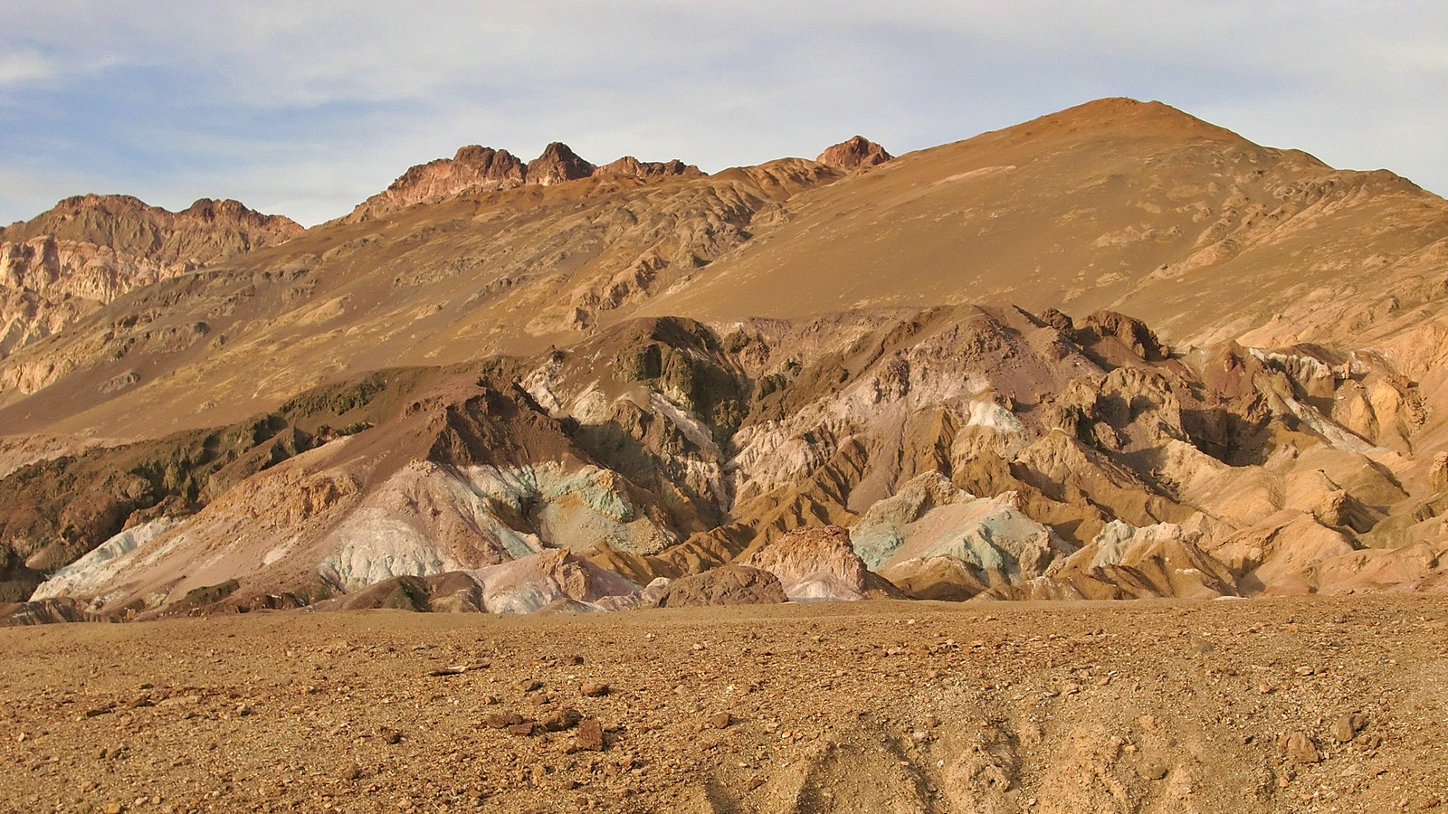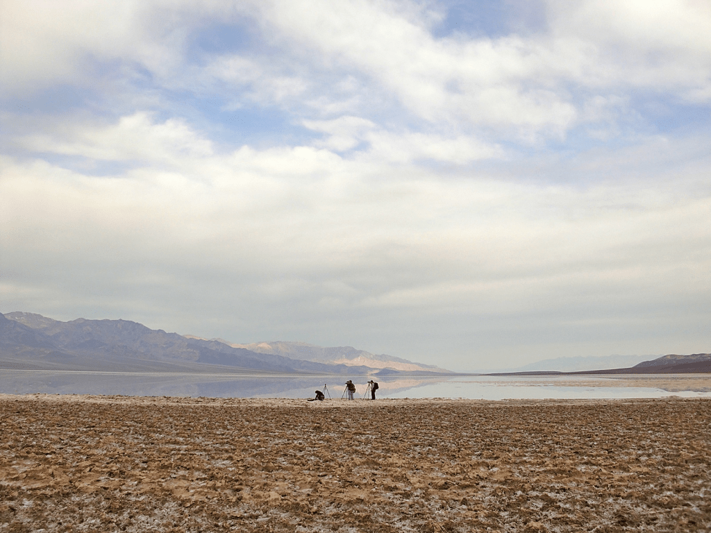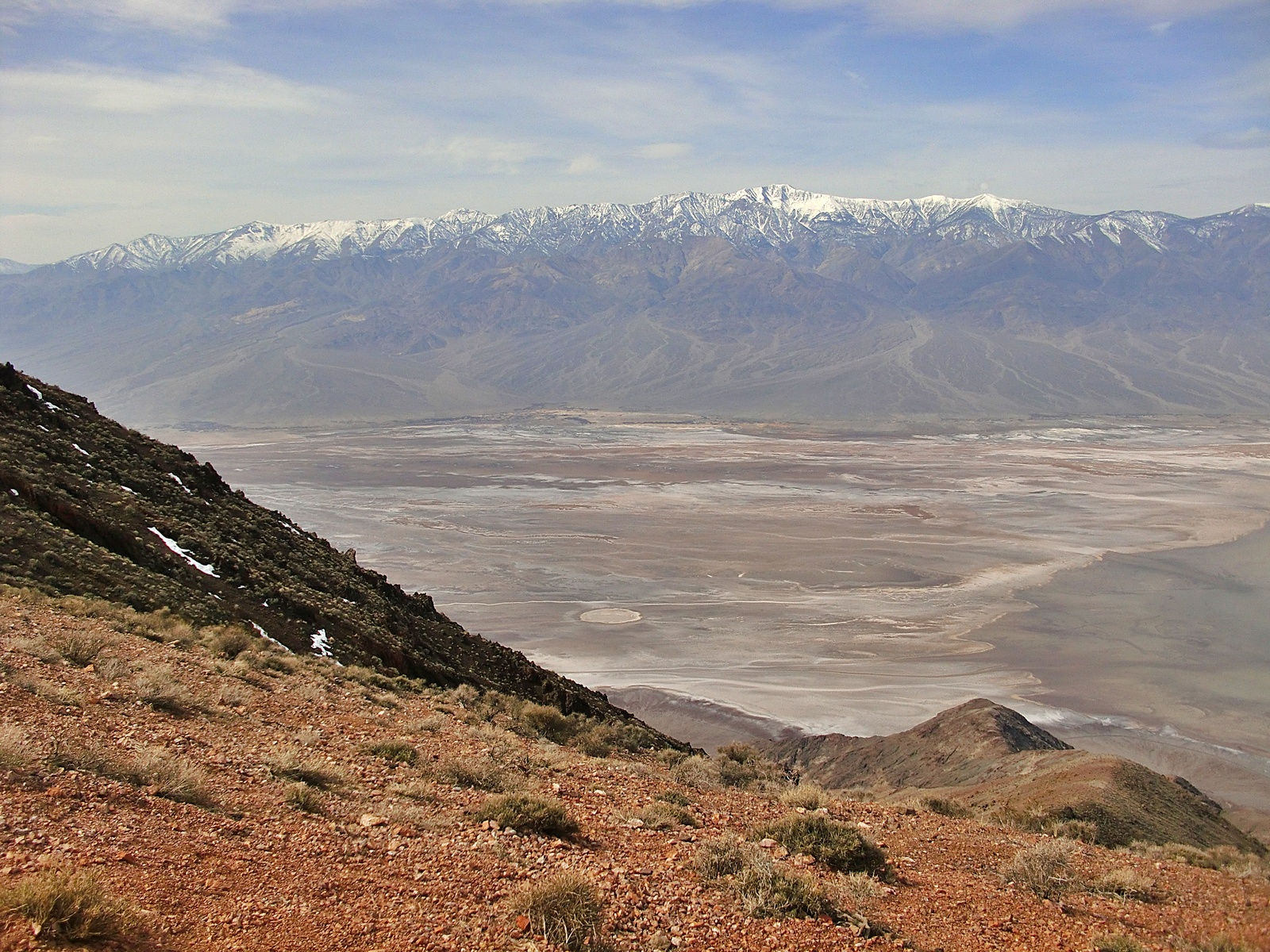 But if low, dry, and hot were all that Death Valley had to offer, it wouldn’t need to be a National Park. We could just fence off a few square miles of salt flats at Badwater, put up a plaque, and forget about it. What makes this park eminently worth visiting is not only its record-breaking extremes, but its incredible, otherworldly scenery – its dramatic slot canyons, its huge sand dunes, its technicolor mountains, and above all, its contrasts. Standing at Badwater and looking west across the salt flats, what you will see is the tall blue wall of the Panamint Range, topped by 11,043-foot Telescope Peak – close enough to the flats that it casts a shadow across them every afternoon. That peak is in the park, too. Few places anywhere have elevations so different in such close proximity to each other.
