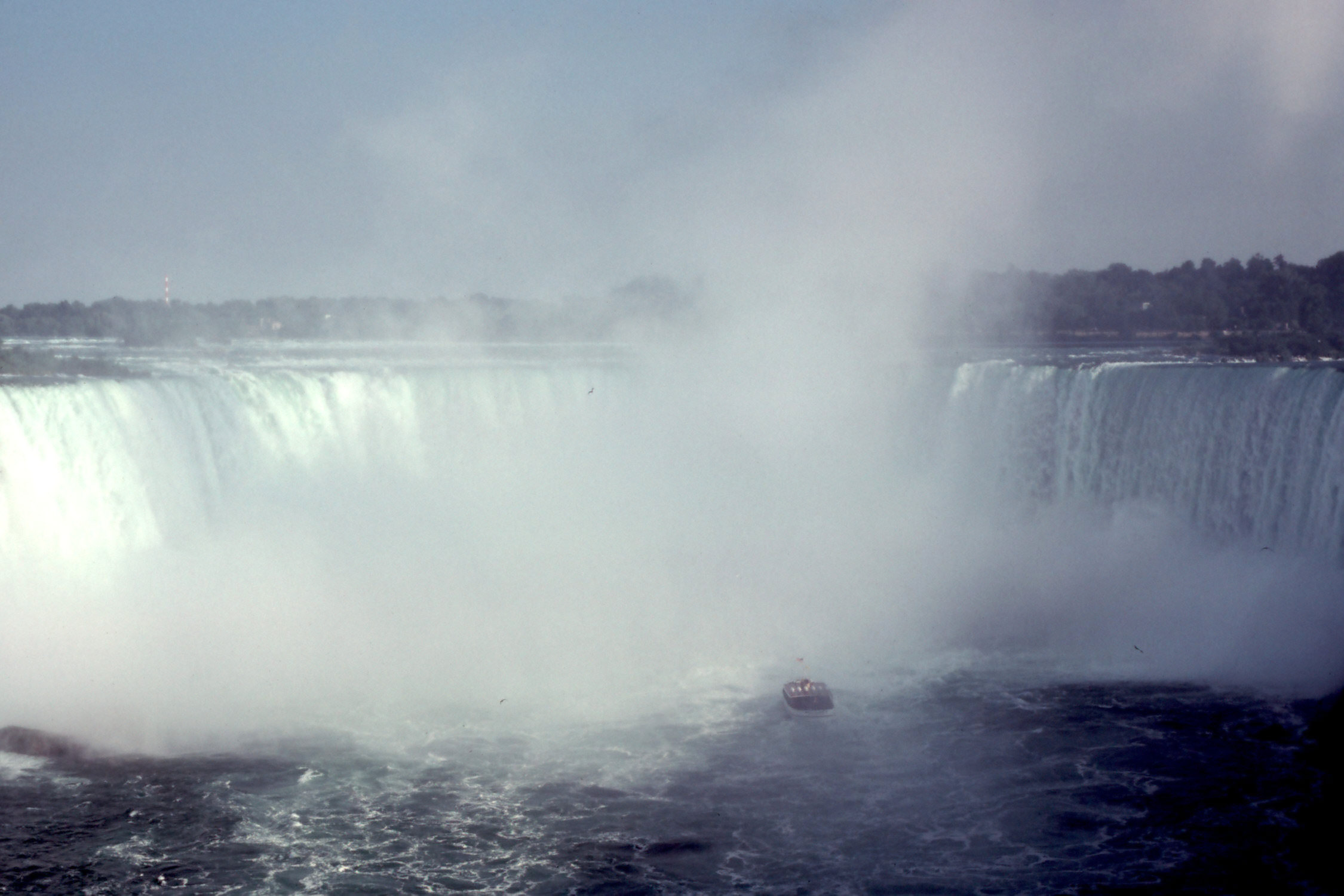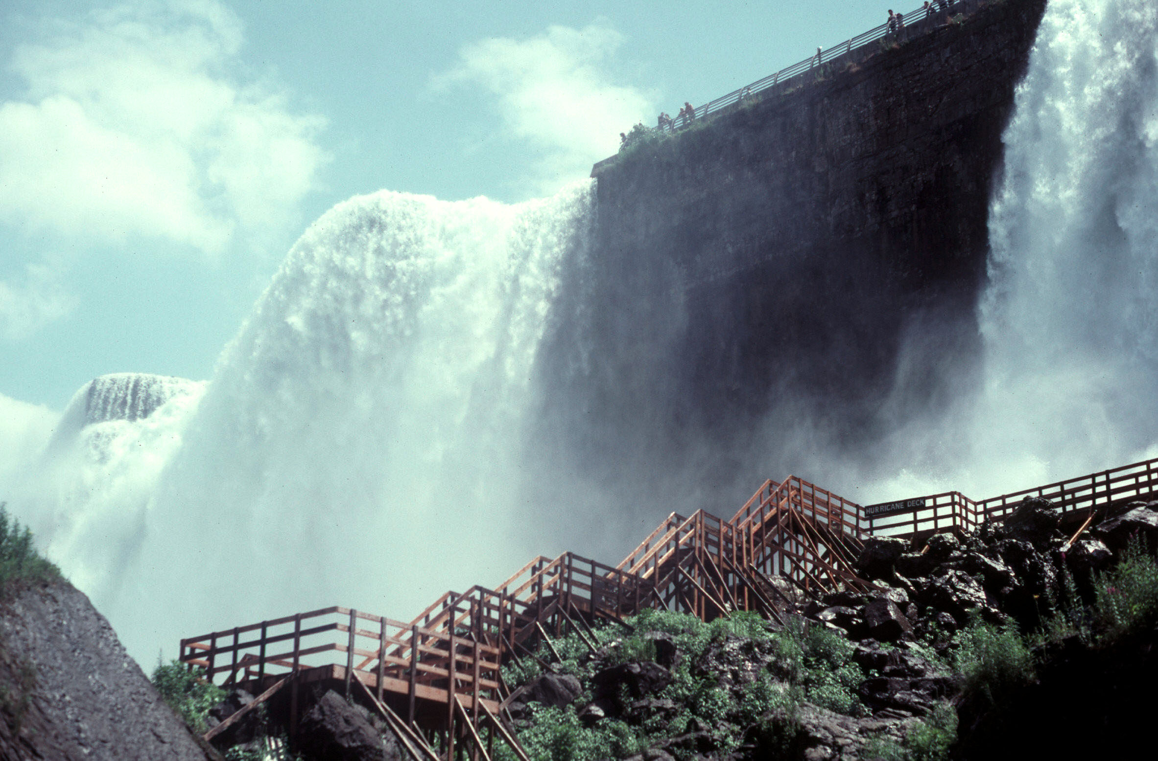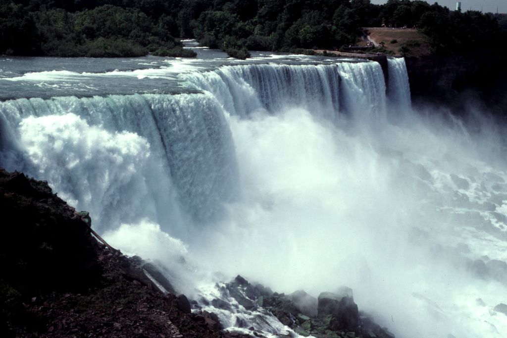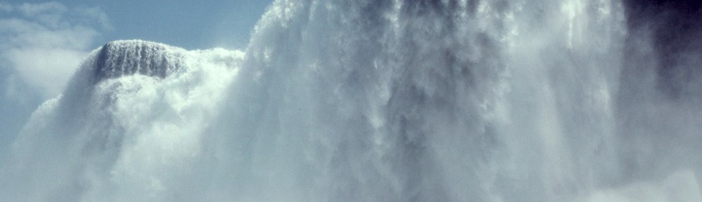 I first came to Niagara Falls in the summer of 1983, in the course of research for my first book on the Great Lakes region, The Late, Great Lakes (Knopf, 1986). On that first visit, geologist Larry Chitwood and I descended the elevator from Goat Island to the Cave of the Winds, at the base of the American Falls, and walked the slippery wooden boardwalks that, despite thick coats of preservative, are soaked so thoroughly by the spray from the falls that they have to be rebuilt every year. On my second visit – in 1990, with my wife and our then-17-year-old daughter – we chose to try Table Rock instead. In each case we were given disposable yellow waterproof ponchos, dropped more than 100 feet in an elevator, and ushered close enough to the Falls that we could almost touch the falling water. The tons and tons and tons of tumbling, thrashing, pounding, falling water. The Niagara River carries the massive outflow from four of the five Great Lakes – the world’s first, third, fourth, and tenth largest salt-free seas, containing almost one-fifth of all the fresh surface water on the planet – and even with half of the river’s flow diverted through penstocks to power much of the State of New York and the Province of Ontario, the Falls are one of the three largest waterfalls in the world. On an average summer day, roughly 2.5 billion gallons of water flow over their brink every hour. Six million cubic feet per minute. More than 3000 tons per second. Faced with those figures, the mind boggles and refuses to comprehend. It is a few bazillion times bigger than a breadbox, and that is as good a description as you are likely to ever get.