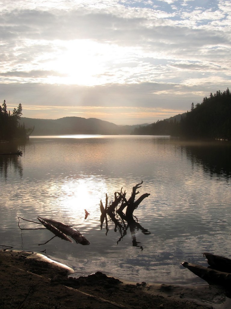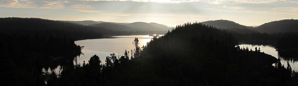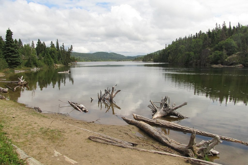 Melody and I arrived at Hattie Cove around 3 PM on a Friday afternoon in late August, 2014. We had our pick of the sites; the campground was only about half full. We were driving a Chevy Volt at the time – an electric car with a short battery range but an onboard gasoline-powered generator that could supply electricity to the motor when the battery ran out – so we chose a site with electrical hookups, plugged in, and went for a hike. We took a second hike the next morning, in one of the prettiest sunrises ever, before pulling up stakes with the battery not quite full and heading back to the Trans-Canada. These pictures, with captions, will let you see some of what we saw. Enjoy your visit.