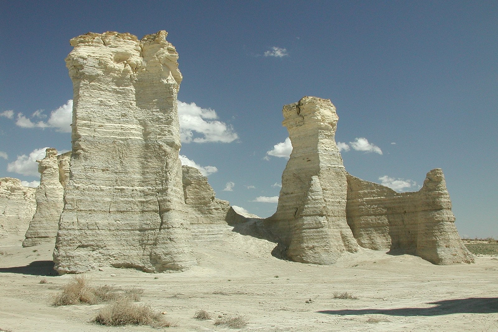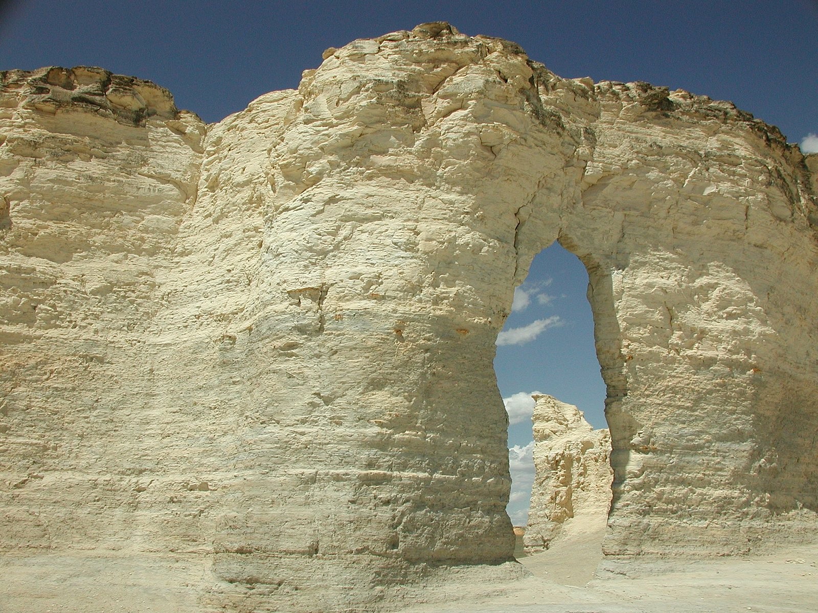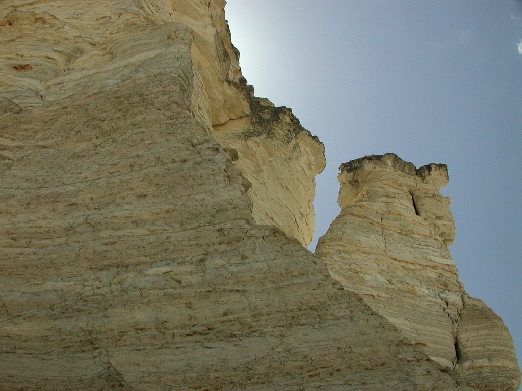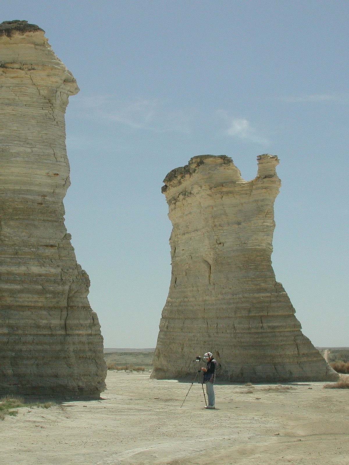 Melody and I visited the Monument Rocks on April 18, 2003, in the middle of research for my book on the Ogallala Aquifer (Ogallala Blue, Norton, 2006). It was a very April day, a day of blue sky and little puffy clouds. The air was balmy. We were the only humans present. The Rocks don’t get many visitors: they are a designated National Natural Landmark, but they lie on private land, so have not been developed. Public access is allowed but not strongly encouraged. Which is probably a good thing. The Monument Rocks are made of chalk – the same material as the White Cliffs of Dover – and popularity could easily harm them irrevocably. But oh, what the hordes who don’t show up there are missing!