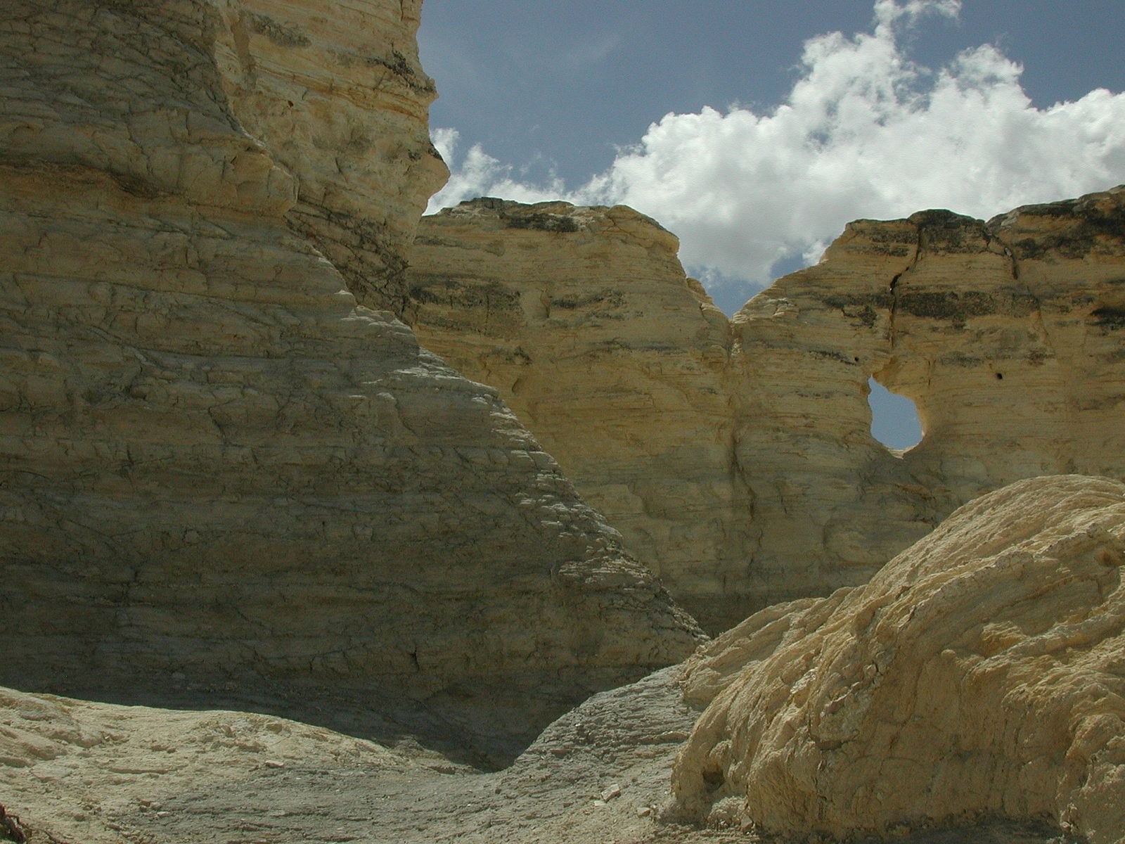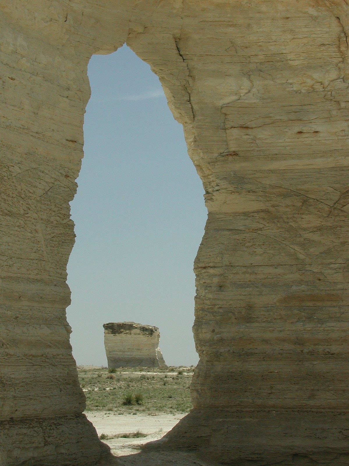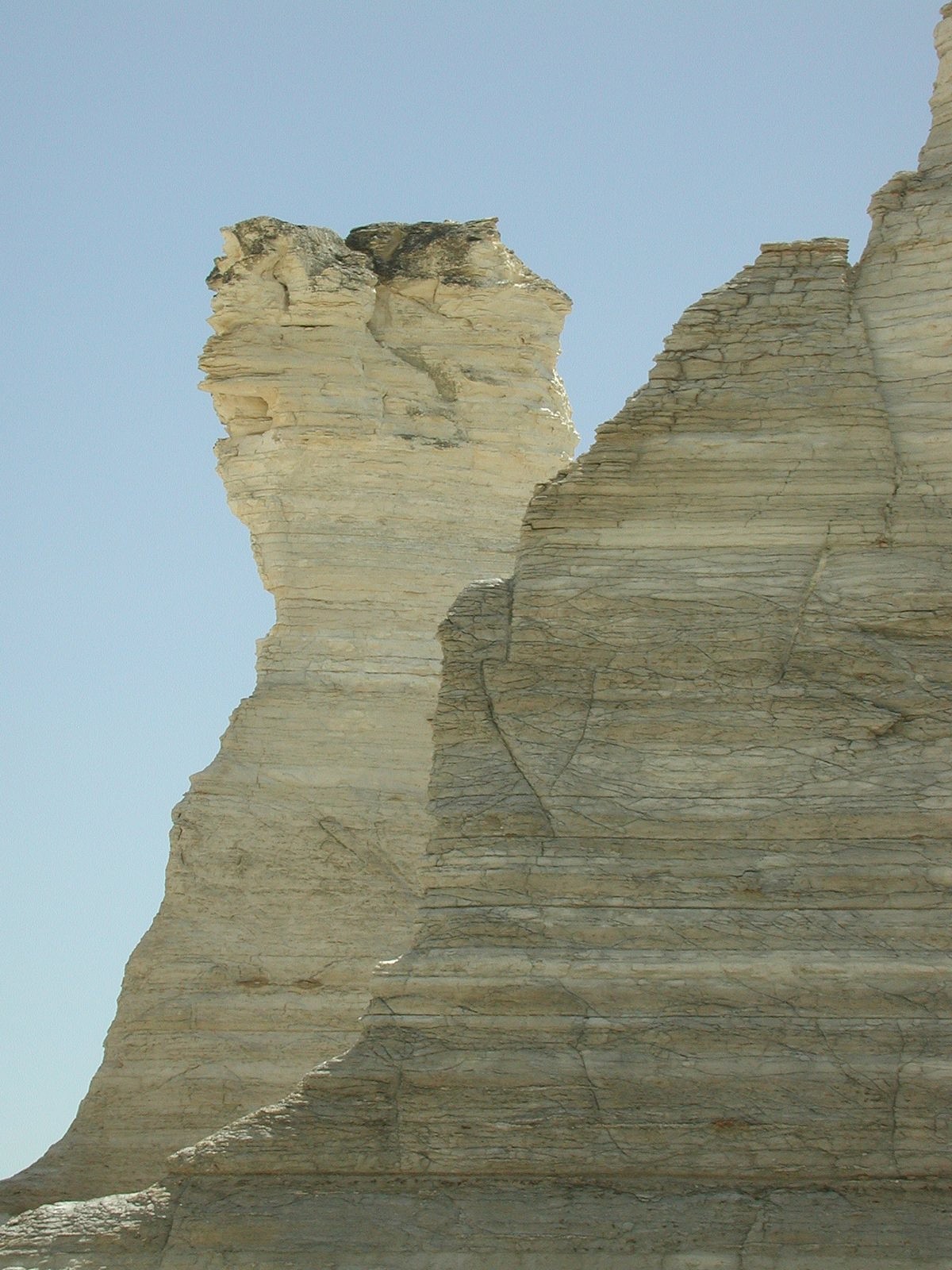 Melody and I visited the Monument Rocks on April 18, 2003, in the middle of research for my book on the Ogallala Aquifer (Ogallala Blue, Norton, 2006). It was a very April day, a day of blue sky and little puffy clouds. The air was balmy. We were the only humans present. The Rocks don’t get many visitors: they are a designated National Natural Landmark, but they lie on private land, so have not been developed. Public access is allowed but not strongly encouraged. Which is probably a good thing. The Monument Rocks are made of chalk – the same material as the White Cliffs of Dover – and popularity could easily harm them irrevocably. But oh, what the hordes who don’t show up there are missing!